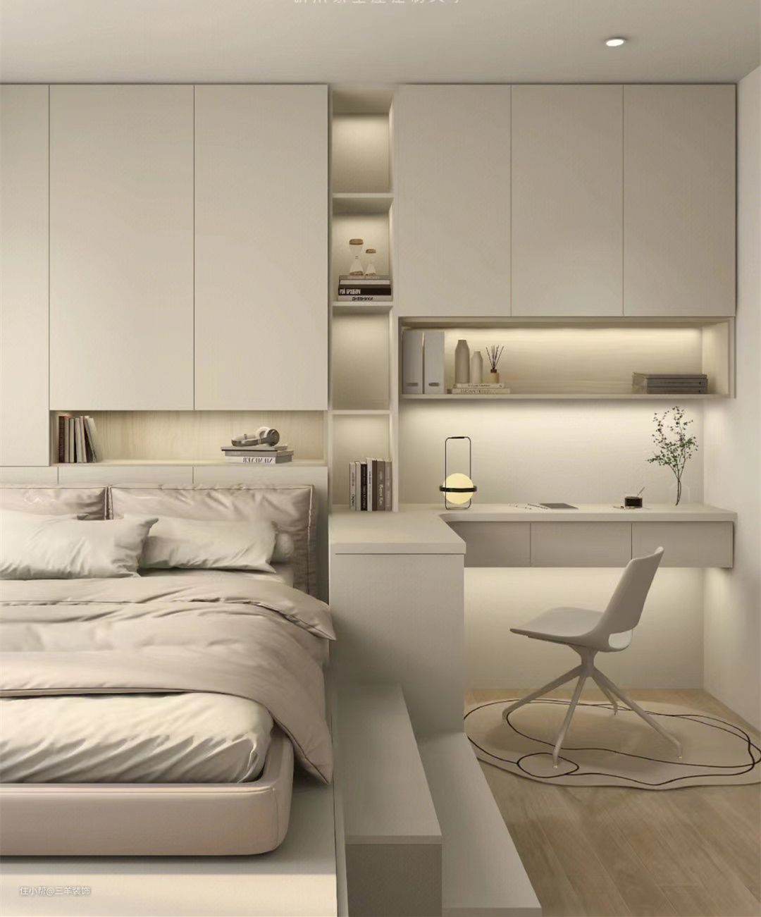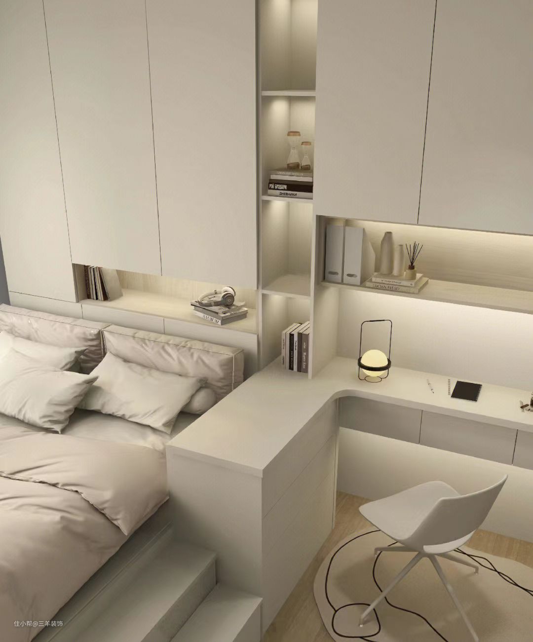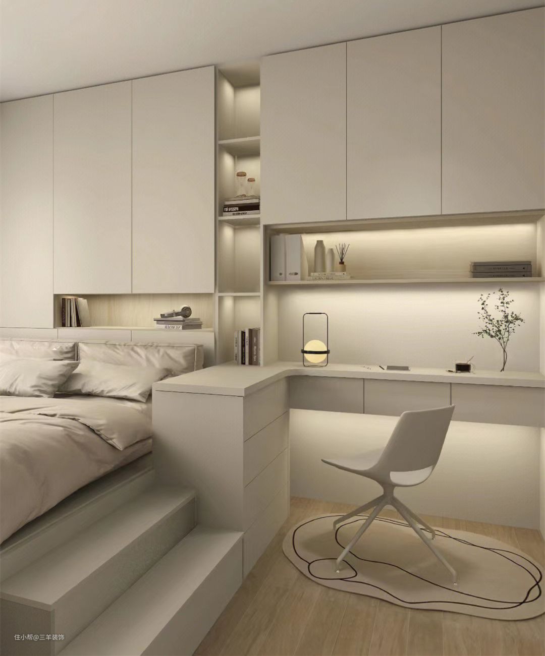 整体采用奶咖柜门,十分简约。台阶还能定制抽屉,储物功能翻倍,转角书桌➕衣柜设计。中间开放格增加层次点缀,搭配内嵌式灯带,氛围感满满💡!小户型利用满分√