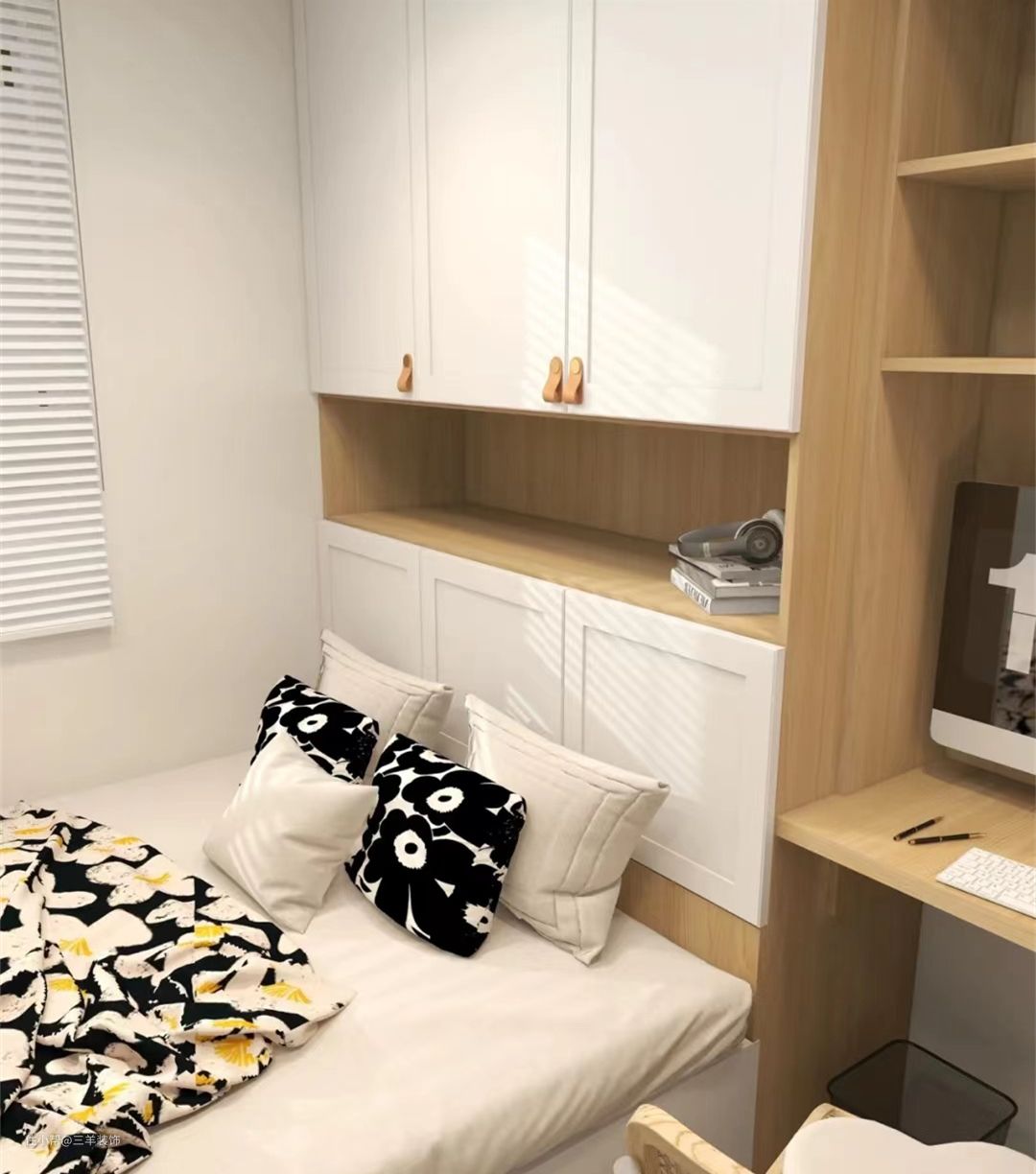 比如上面的小卧室,左侧衣柜与书桌书柜一体定制。榻榻米满足次卧功能,同样是木色与白色布局,空间利用率要比床更合理实用。