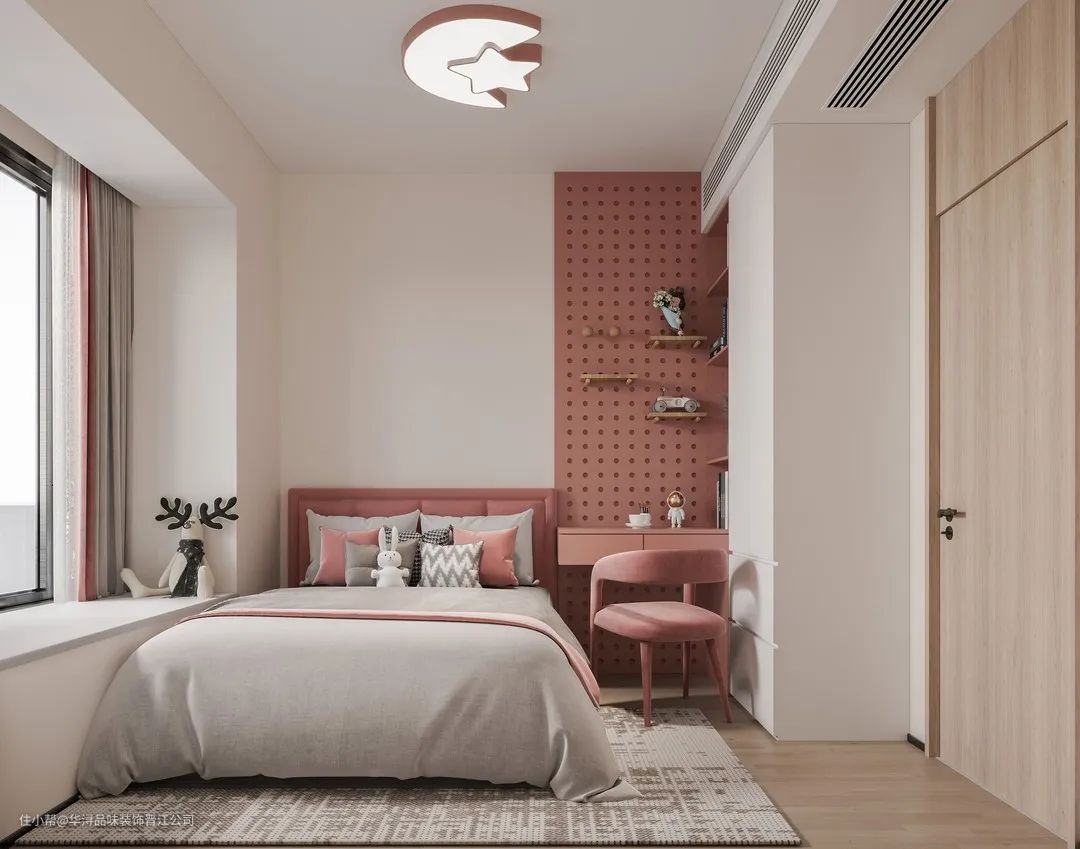 儿童房被温柔治愈的奶白色和蔓越莓色所包围,洞洞板作为时下具备了颜值和简易性、多变性的单品,不仅不占空间,还能让孩子根据需要在上面随意组合,打造属于自己的风景墙。