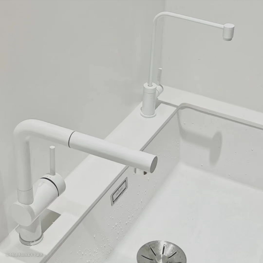 固定的水龙头出水范围小,很多地方冲洗不到;抽拉式水龙头360度无死角清洗,很方便。