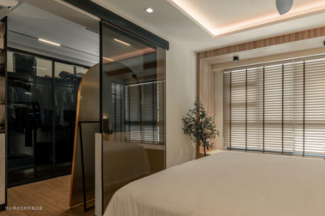 如果你想找一个精致而又不狭窄的房间,你可以选择一个像房间一样的步入式衣柜。这里有一间卧室,被黑色的玻璃门(滑动门)隔开。这些宽大的门营造出一种和谐的感觉。在里面,你有一个大镜子和黑色玻璃在衣柜里隐藏衣服。这一个是更高档和复杂的。