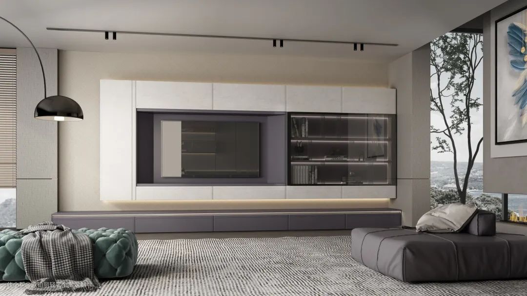 此外电视柜采用半开放式设计,简洁利落。加上木纹、大理石背景墙的多材质混搭设计,展示出空间的动态平衡。
