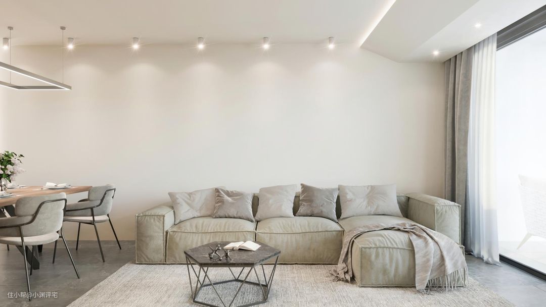 颜色上,要选白色。白色对空间的存在感最低,刷在天花板上,不会让人觉得压抑。但是反过来想一下,如果你家客厅是挑高设计,可以在天花板上刷彩色,让整个房间显得没那么空。