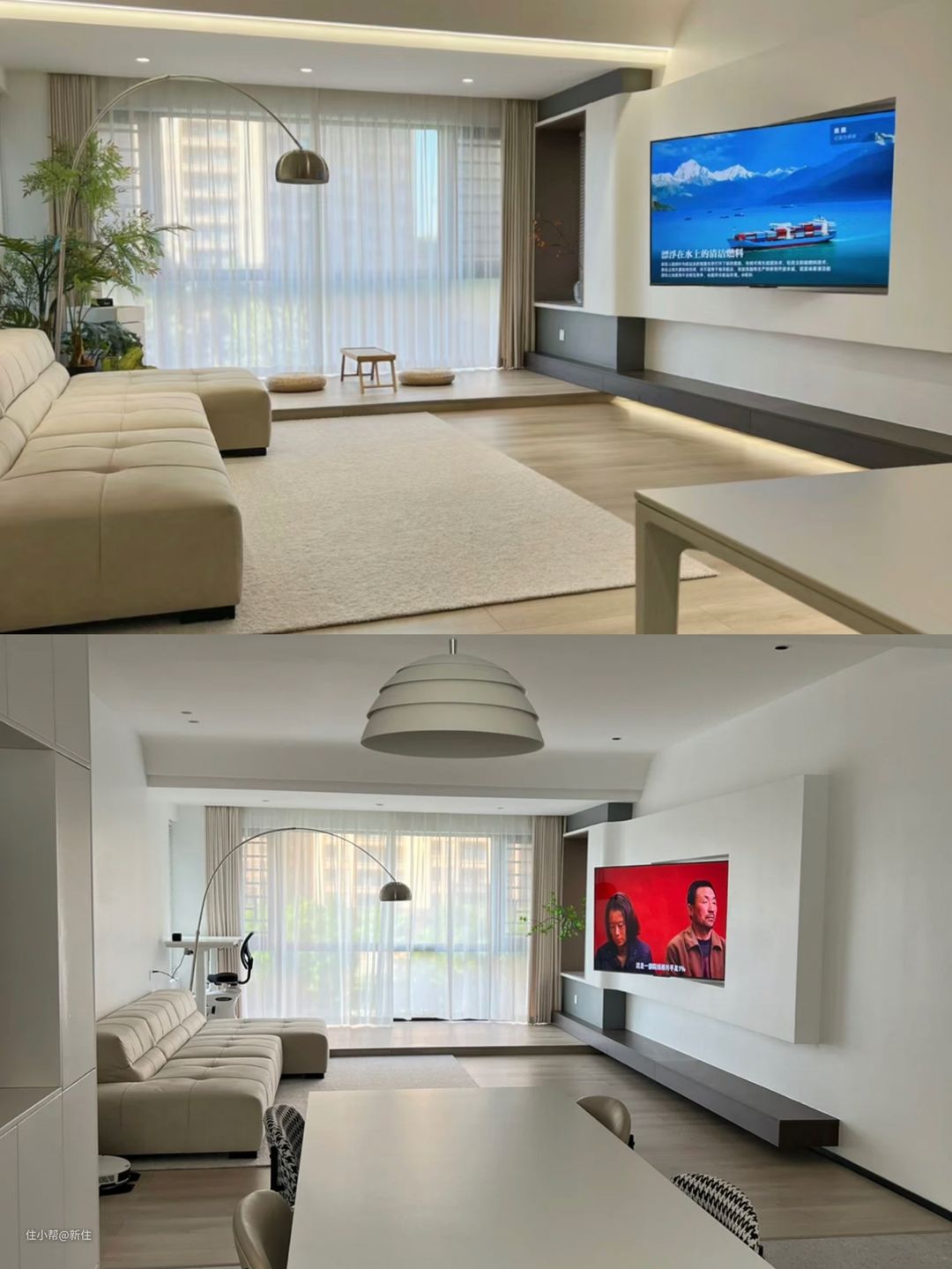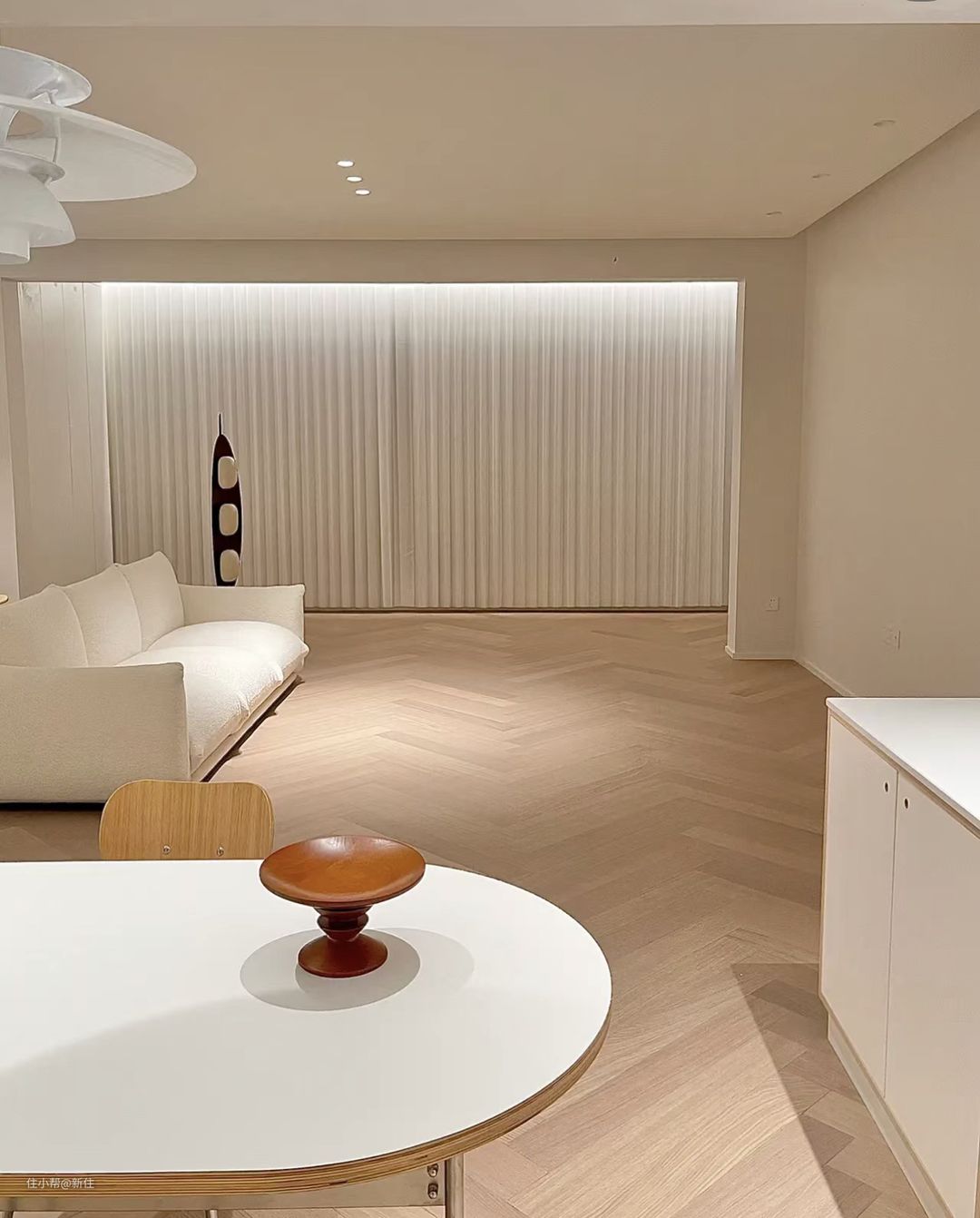 就更别提从她发的内容中,我还窥见了她家的全屋悬浮吊顶、人字拼地板、考究的无主灯设计以及8米的梦幻帘+灯带了。