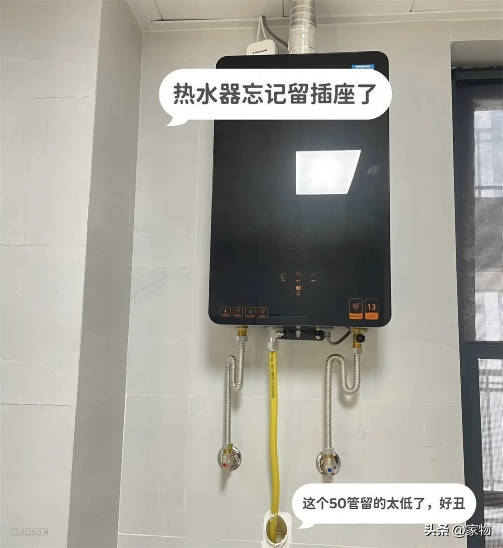 家里热水器装完以后,总觉得少点儿什么,真正要用的时候才发现,原来是忘记留插座了,后续只能再重新引线接插座,费了不少事儿,而且底部的50管留得太低,看起来别提多别扭了,这两点大家可要注意。