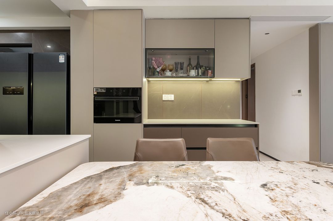 餐桌后方设计餐边柜,浅咖色无拉手设计,将空间的品质感最大化。合并餐厨空间,那么在配色上能更为统一,缩短了动线空间,餐边柜和橱柜的结合让空间利用率最大化,在餐边柜嵌入烤箱,在闲暇的周末能得到最大化的利用,提升居住品质感。 餐边柜中间留空,为了避免吊柜遮挡影响操作,在留空处预留开关,可以使用一些小电器。吊柜做了一组玻璃柜门,里面放置藏酒和酒杯,可以作为酒柜使用。
