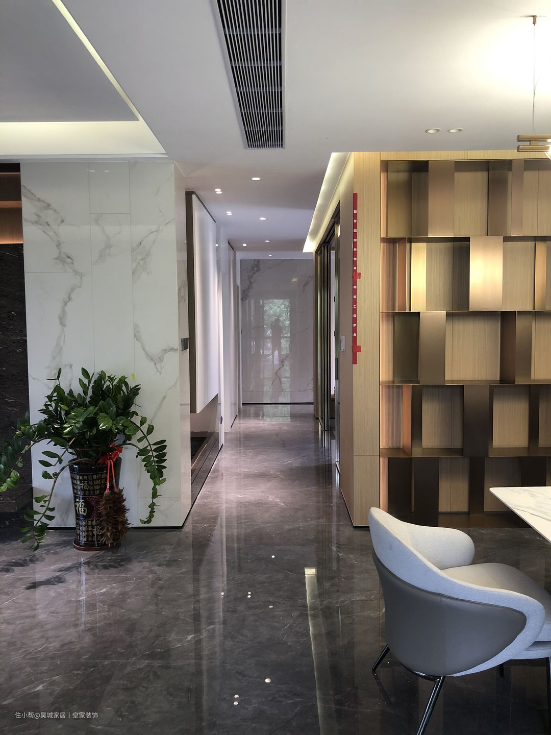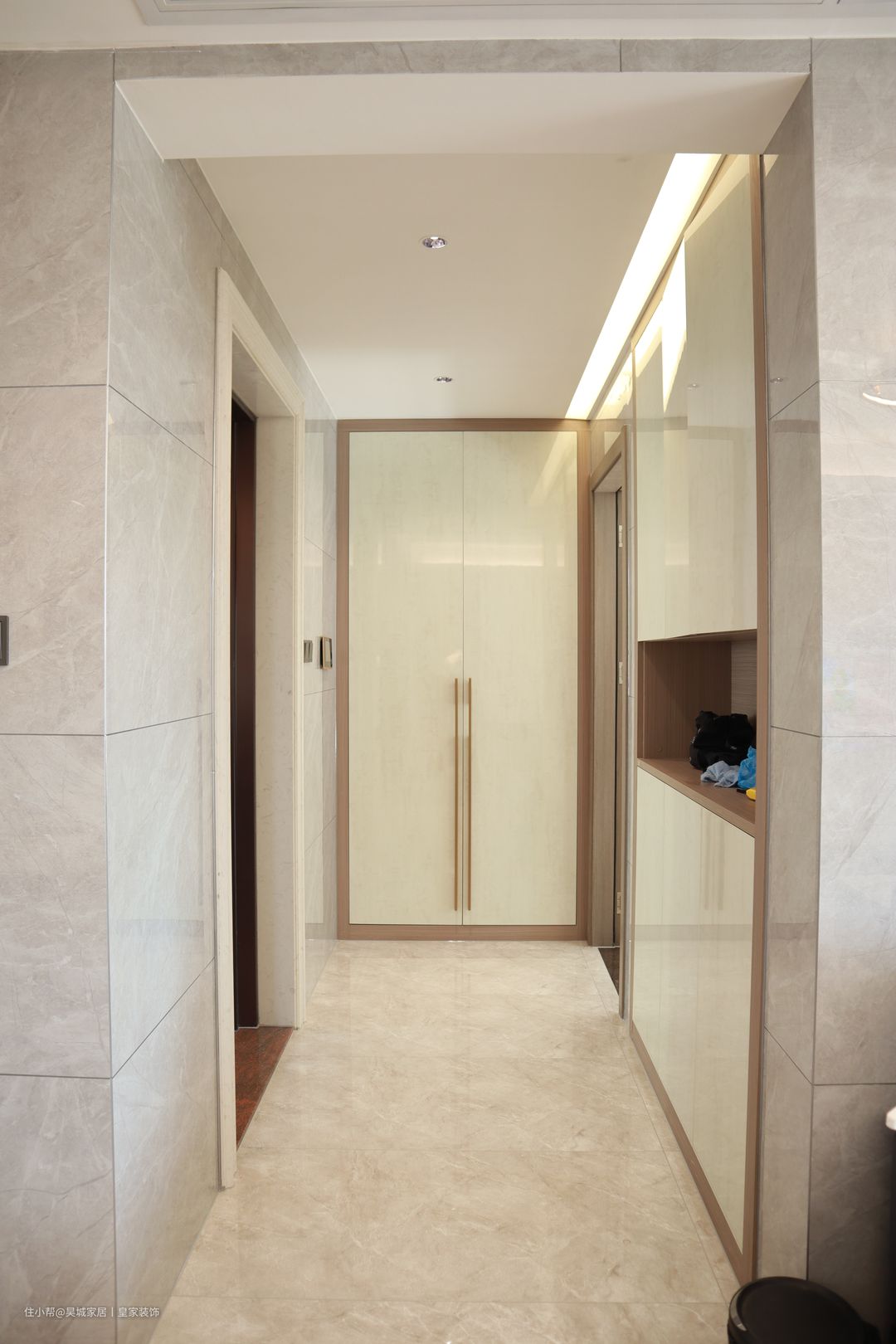这类玄关空间比较狭长,考虑面积问题的同时,还要兼顾视觉效果,所以设计上的要求会比较多。宽度够的走廊型玄关,可以做封闭式玄关柜,更容易清洁,还显得整齐有美感。如果是细长型的走廊玄关,就建议您选择入墙式的玄关柜,不会占用您的过道面积,还隐藏了使用的空间。