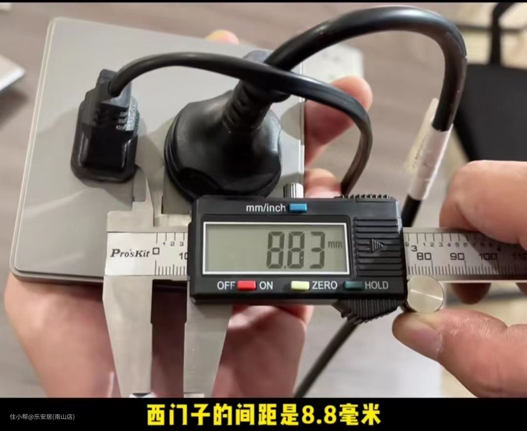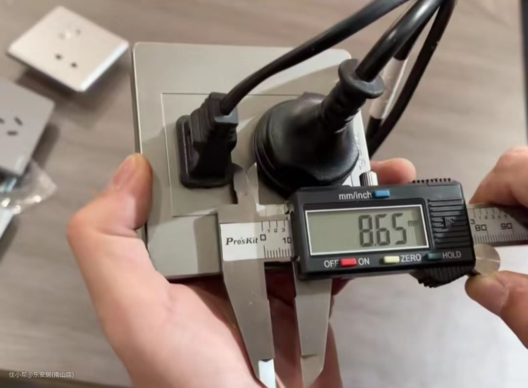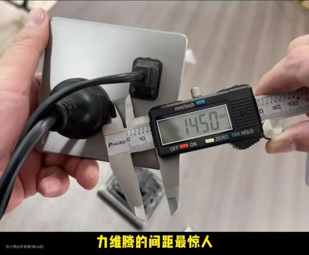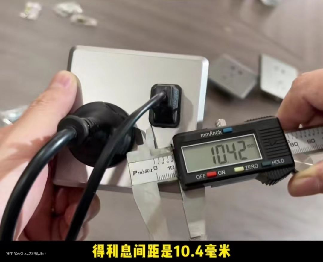 3、再来对比无孔间距,间距大就意味着两个插座可以同时使用,更加便捷。在测量一下孔距,我们同时插两个插头,对比之后发现,欧普的间距是4.2毫米,公牛的间距是8.6毫米,西门子的间距是8.8毫米,德力西间距是10.4毫米,立维腾的间距最惊人,达到了14.5毫米。这里面表现差一些的是欧普,这一款插座间距就很小,用大点的手机充电器就很难再插三项插头了,立维腾和德力西都是斜五孔,用起来更友好了。