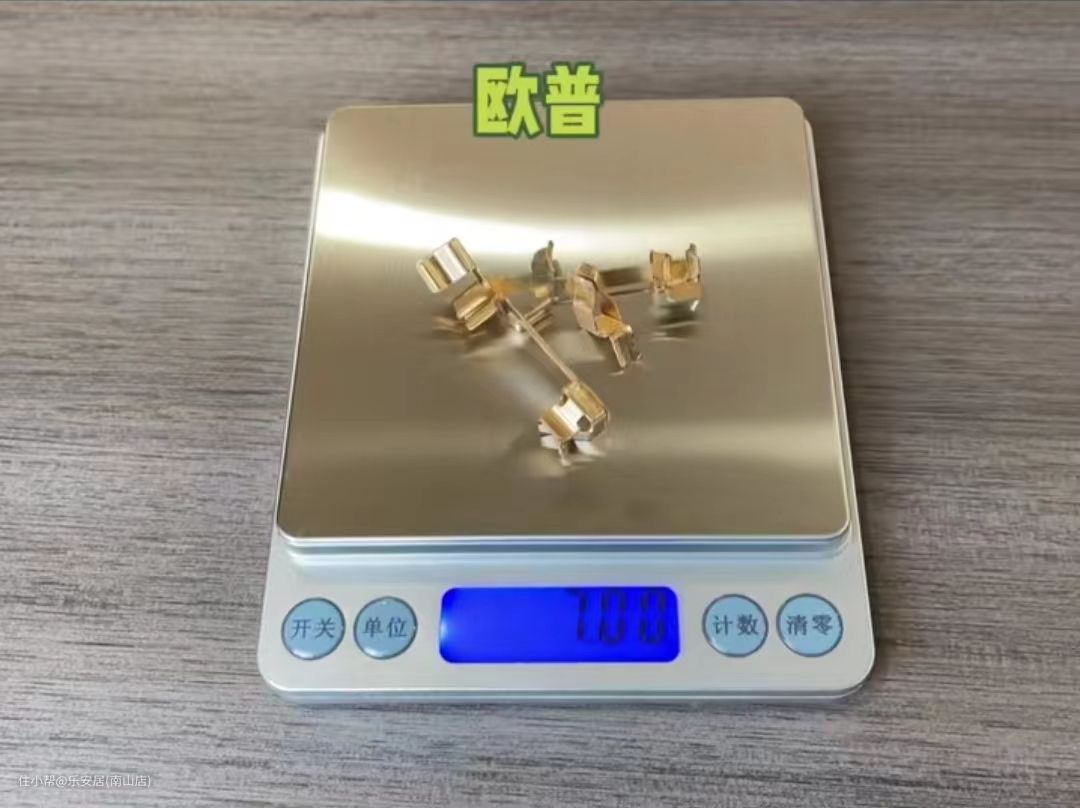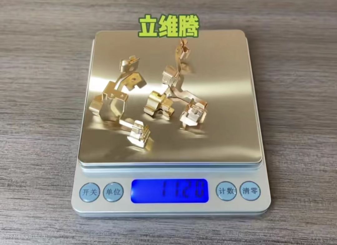 6、我们拆下来的黄片分别称重一下,西门子9.13克,立维腾11.21克,公牛7.42克,德力西7.25克,欧普7克。对比下来,立威腾这个品牌表现最突出,欧普的克数最小,说明立威腾的用料更扎实更厚道一些。之前我们测试有的插座使用之后会出现发热过高的情况,其实这跟载流件有关,如果最小的横截面面积太小,导致电阻太大,就很容易升温。