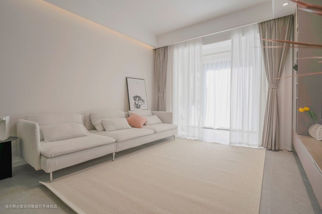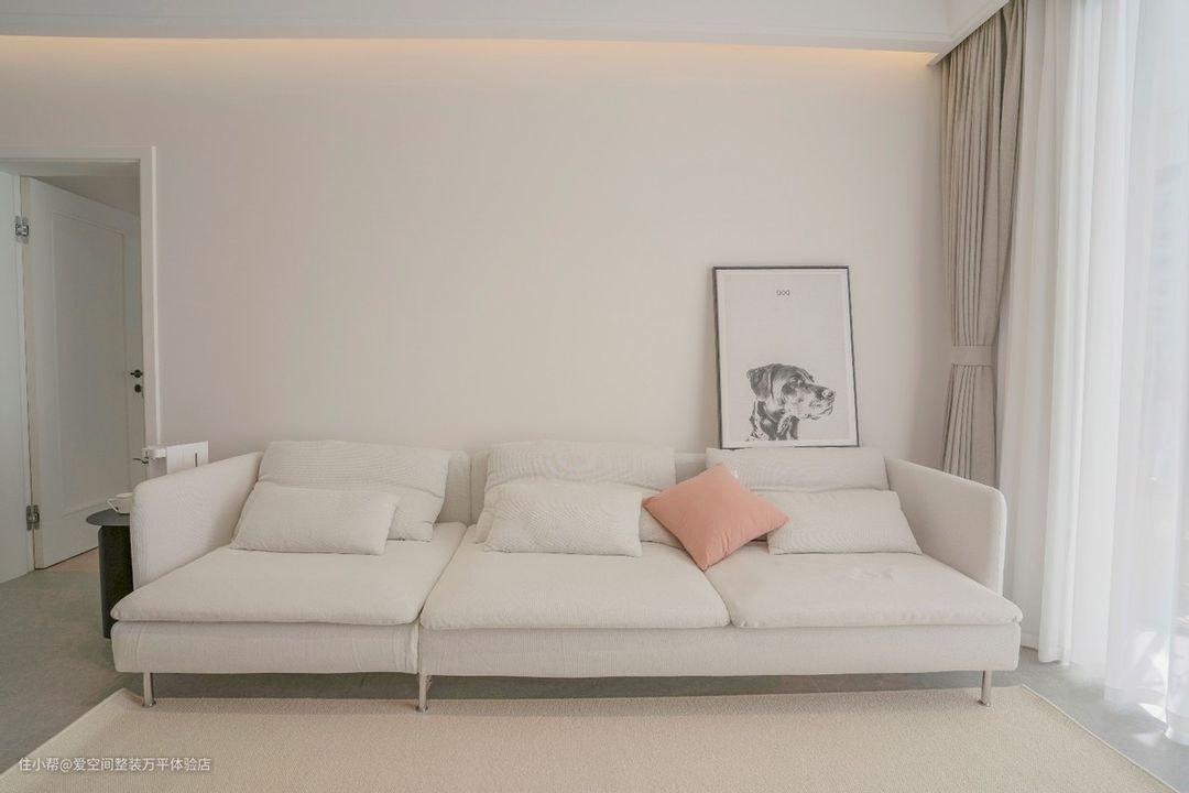 轻装修重装饰,没做复杂沙发背景墙,简单白墙+装饰画,客厅四周回形灯槽吊顶+灯带,氛围感满满,奶油白色沙发搭配柔软舒适的米色地毯,放上蓬松饱满的粉色系抱枕,显得客厅温柔又好看。