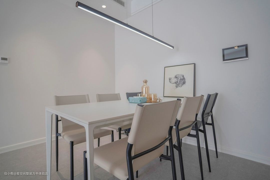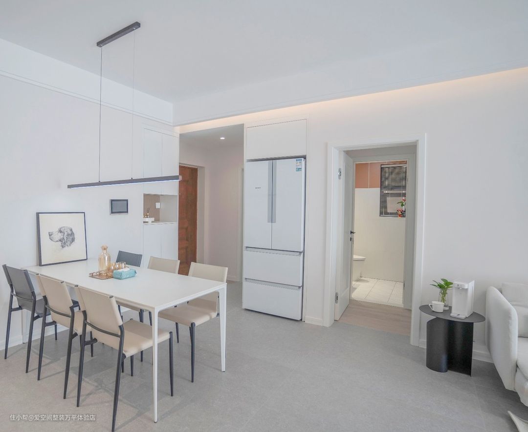 冰箱放在了客餐厅,内嵌进墙里,整体看上去也非常美观,放在这里也非常方便使用。六人坐餐桌非常实用,平常有朋友来聚餐也可以招待。