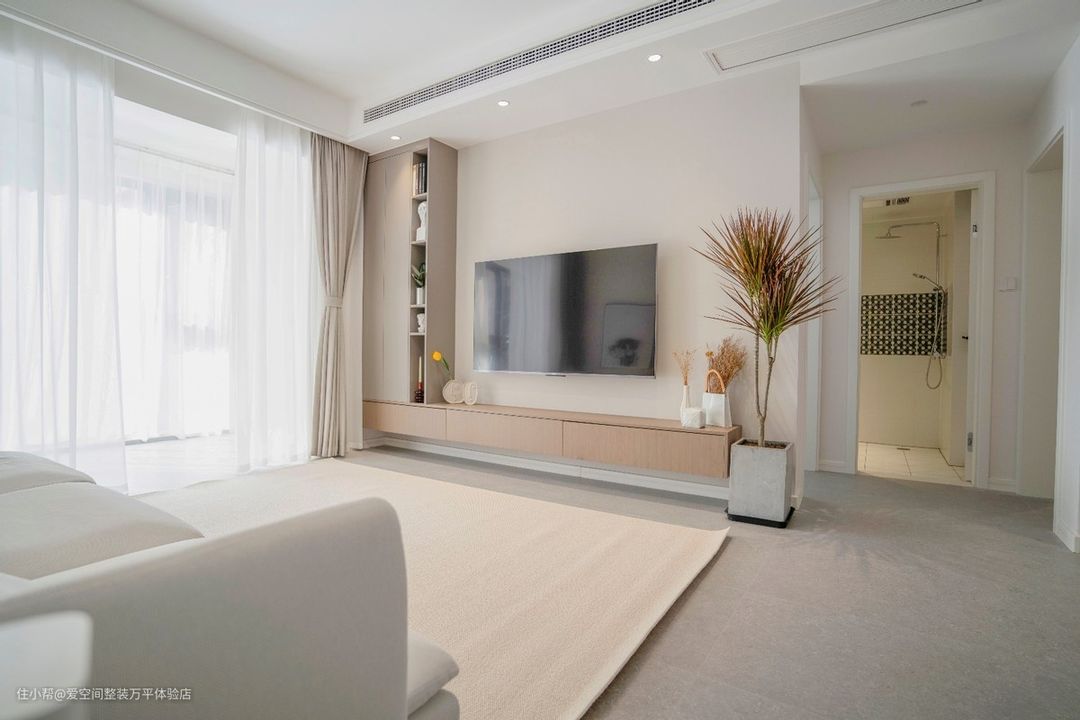 客厅抛弃繁杂的造型,整个空间以白色系为主,让客厅显得既清新又不失时尚,无主灯设计、提升了空间的通透感。