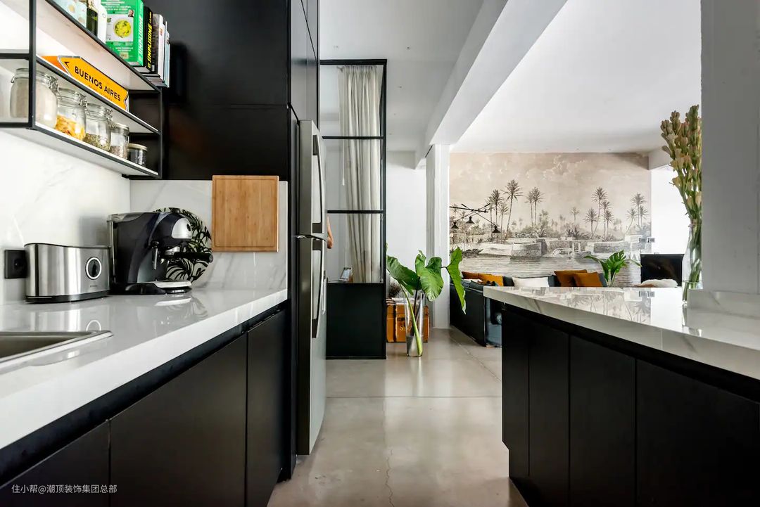 本案采用了墙顶地一体式微水泥设计,将极简感刻画得淋漓尽致,打通卧室空间作为生活区,LDK全开放,一座L型岛台连接三个功能区,串联起家具生活动线,具有强烈的社交属性,打造丰富的多场景生活模式。 整个户型不管是那个空间都选用了侘寂工业风,但是丝毫不沉闷反而尽显power。