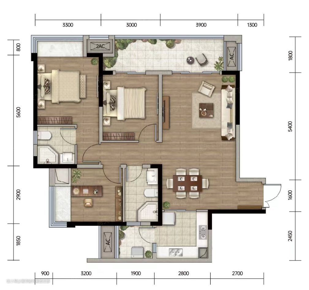 1.客餐厅全开放,打造成一体式公共活动区,居家生活自在宽敞。