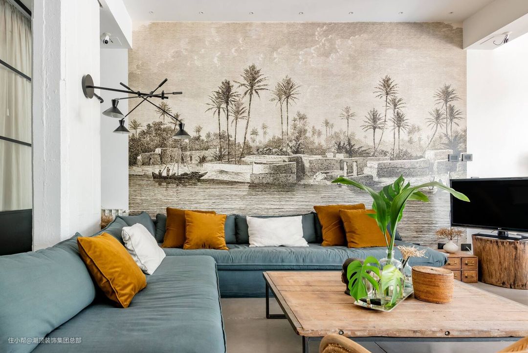 全屋墙地顶采用一体化微水泥设计,而且搭配开阔宽敞的空间布局,空间上没有视觉的阻挡自然就实现视觉上的极简感。 另外我们客厅做了无主灯设计清爽利落,充分让阳台融合进室内空间,视觉上更统一。 搭配深蓝色+橙色的沙发靠背以及背景墙水墨画的设计,这样的不仅让空间简约感更强了艺术感也有所提升。 #客厅 #微水泥 #无主灯设计