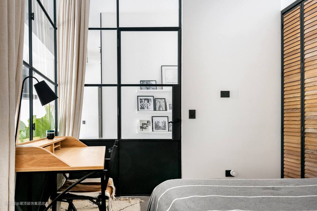 书房跟玻璃门隔断,黑色细框无比精致优雅,复古感壁灯烘托舒适阅读角,整体充满着书香气息。 #书房 #玻璃门 #长臂壁灯