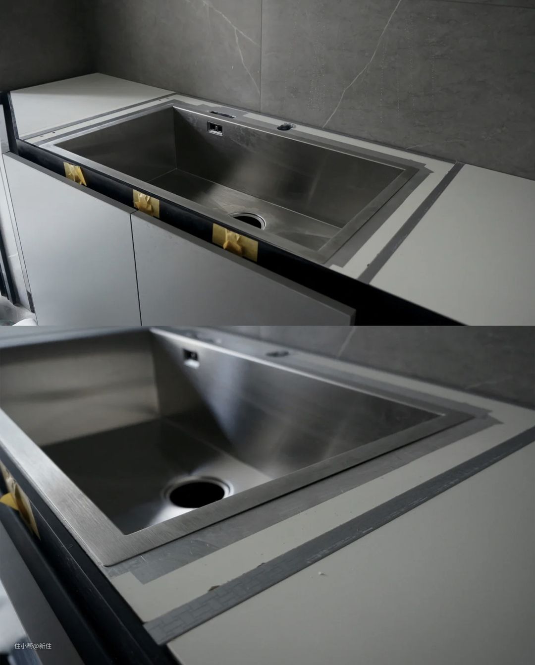 唯一的局限是:下面的水槽柜的大小跟水槽的大小,就差不多了,不能像第一种台下盆做法那样,可以大水槽柜、小水槽。不过这也不影响什么。