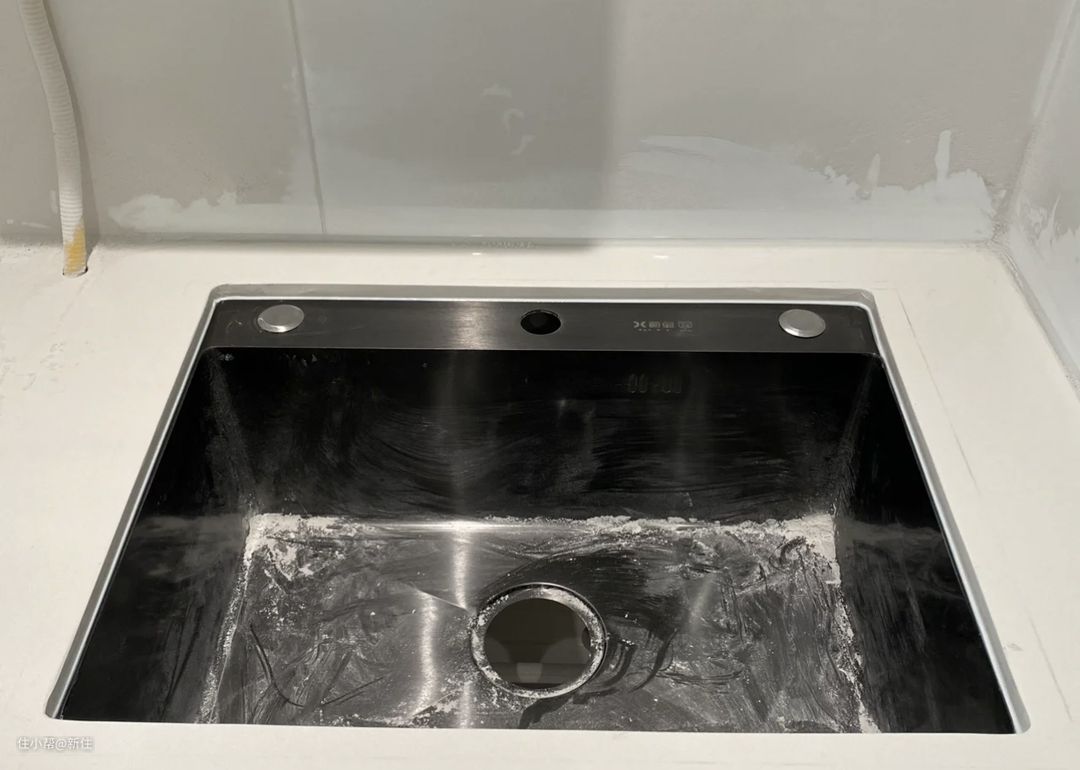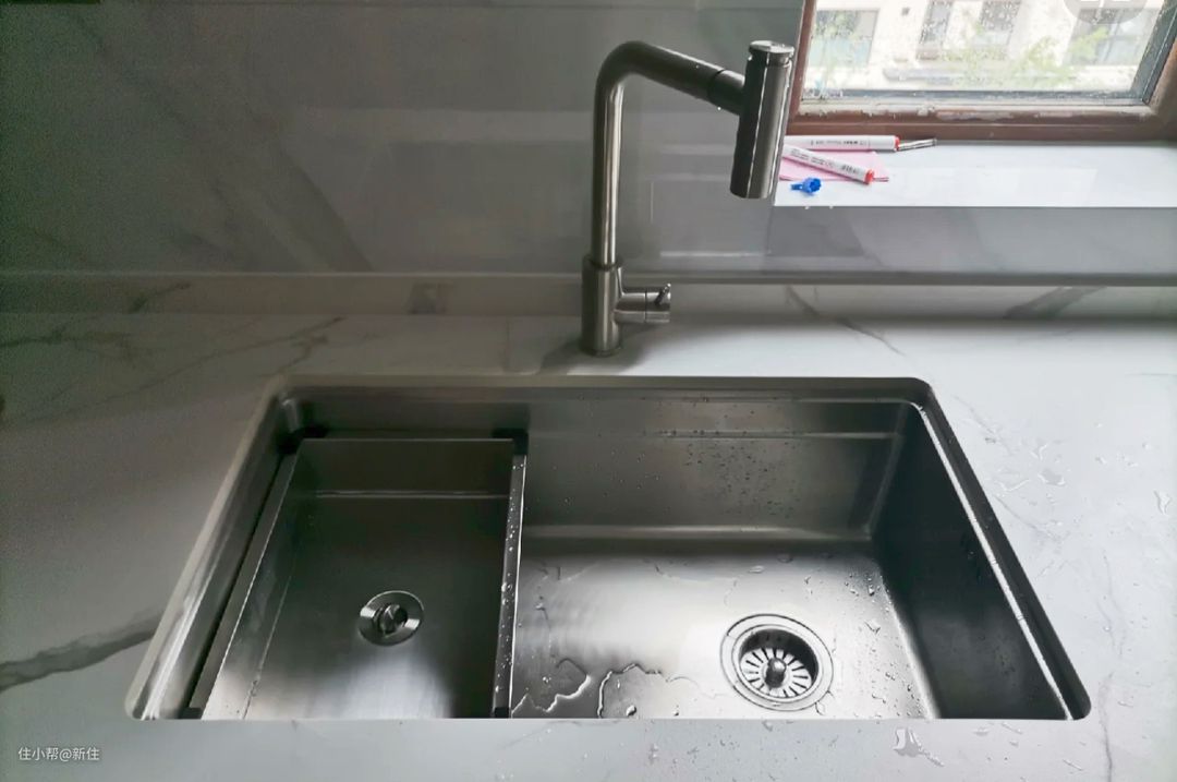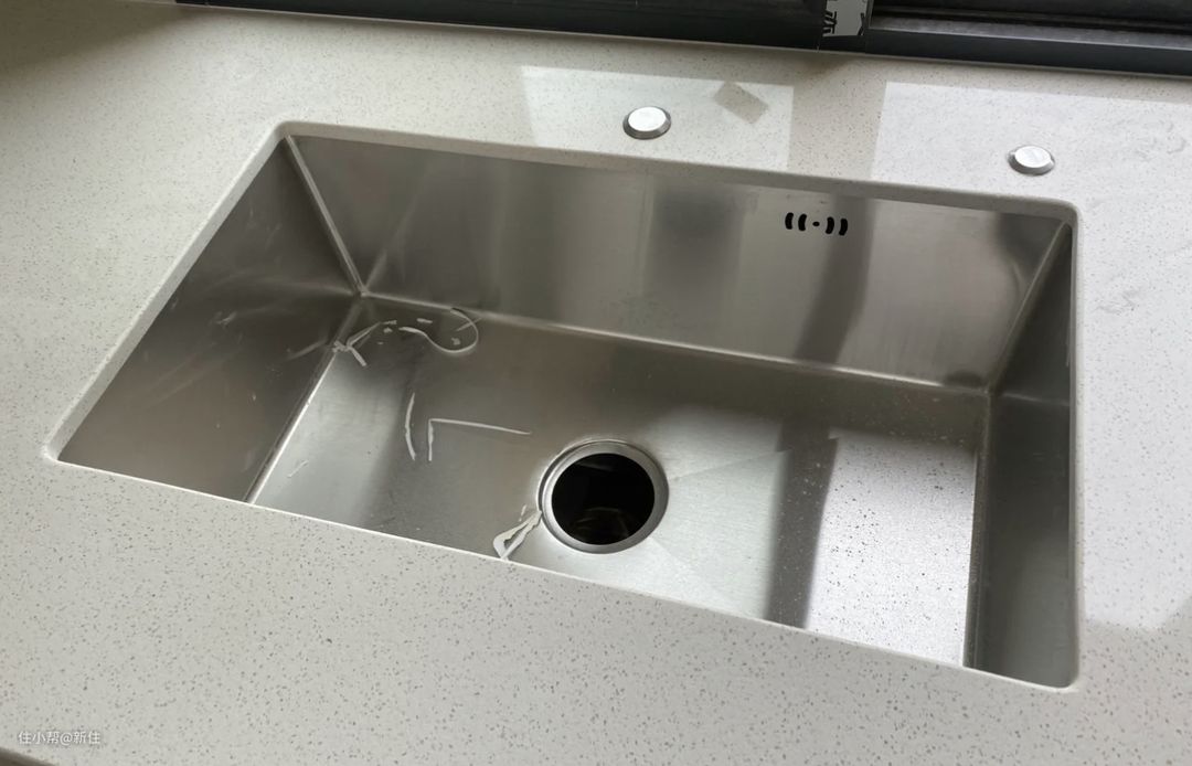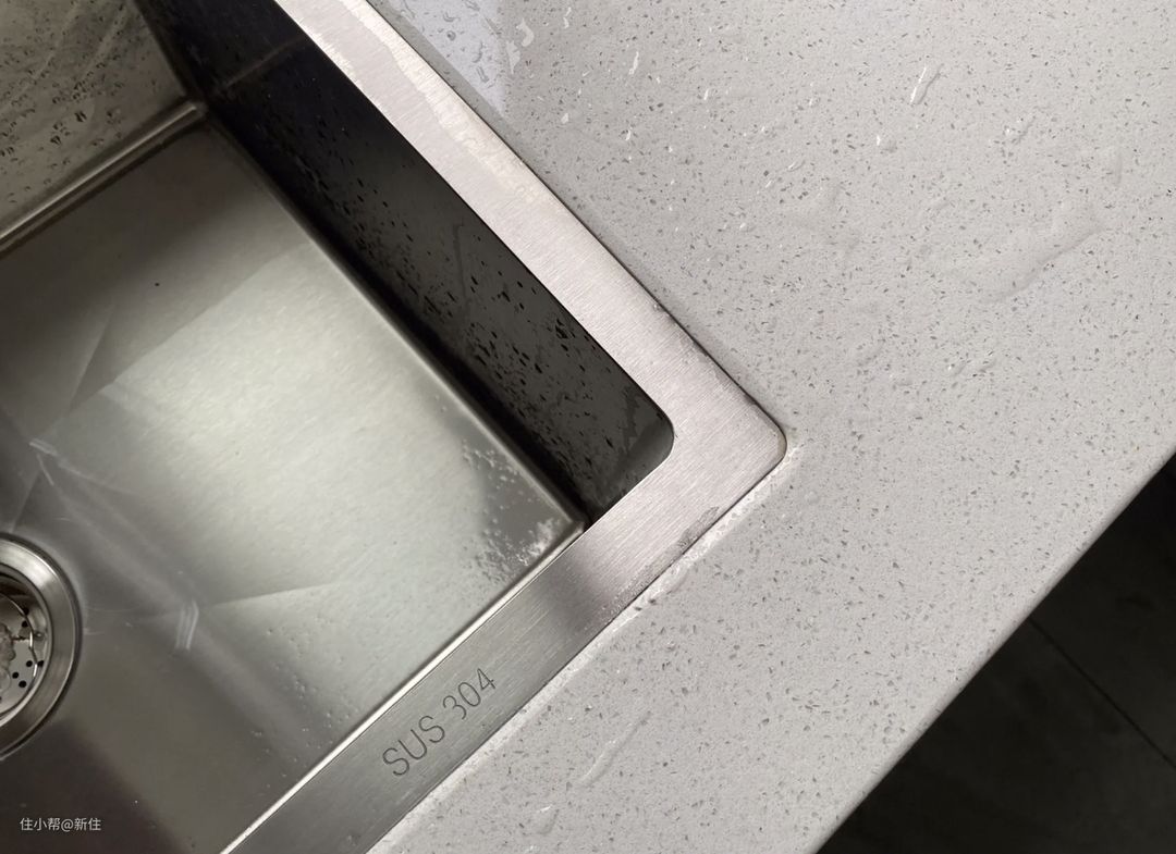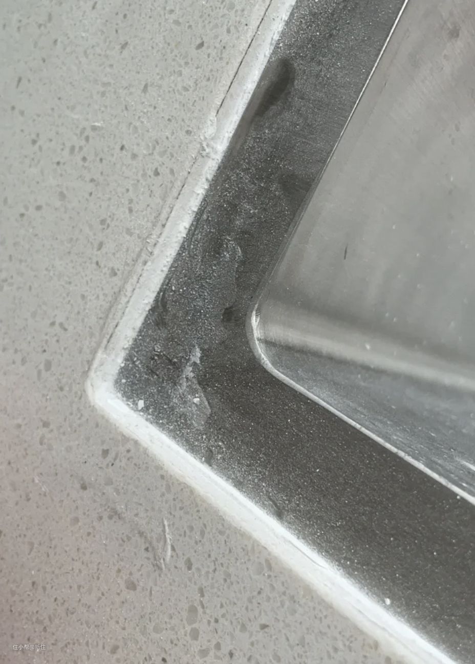 而且,时间长了,水槽边缘还可能会起翘,台面与水槽边缘,形成缝隙,水从缝隙钻进橱柜。