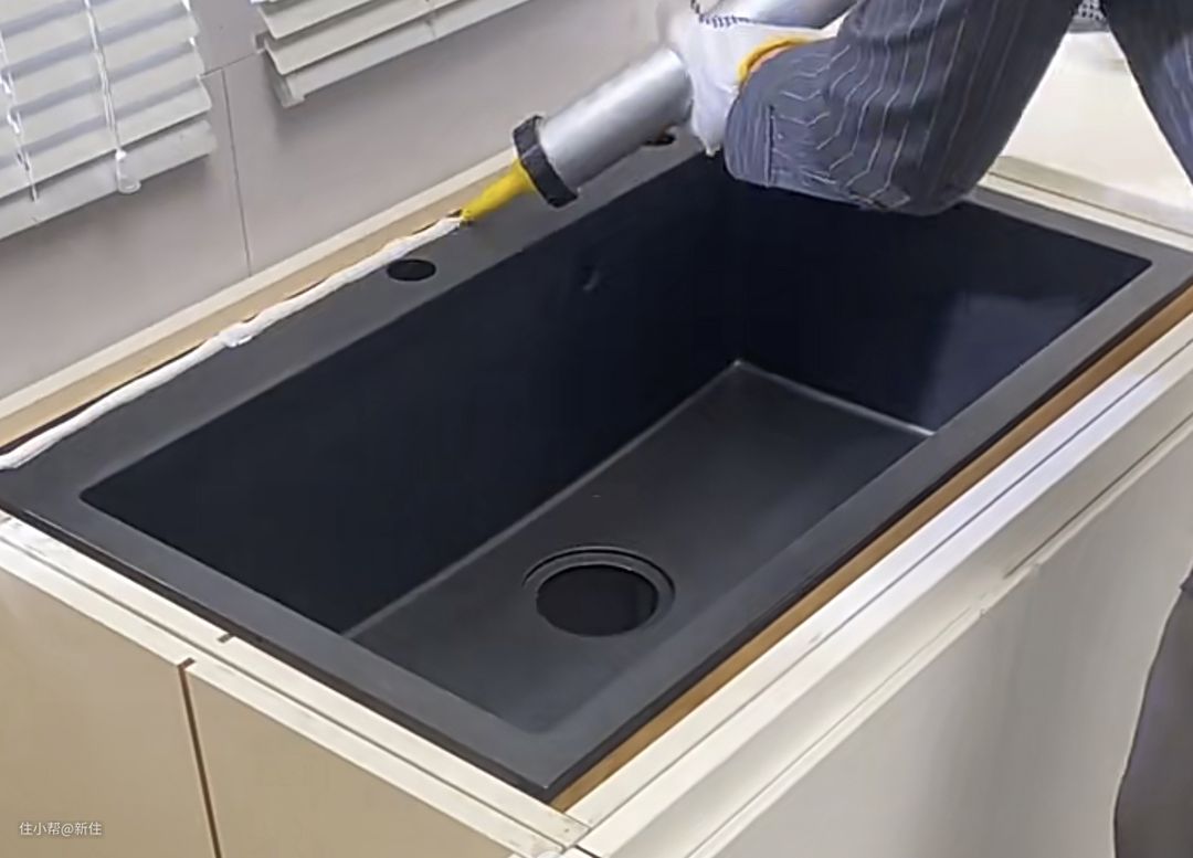 最后,再打结构胶、盖台面、给水龙头、净水水龙头、皂液器等开孔等动作。