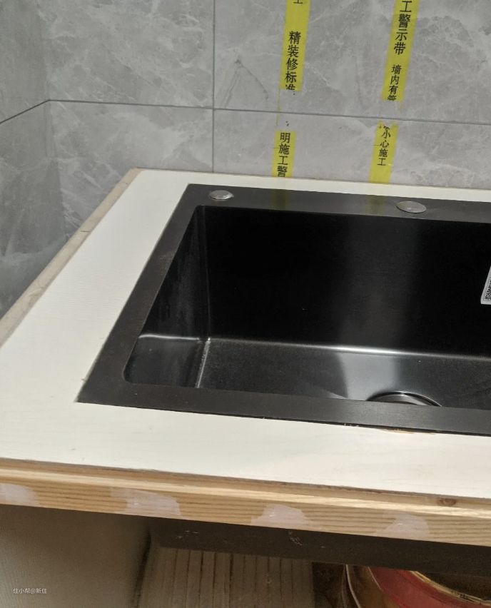 接着,再开台面的孔,开孔尺寸,依据台盆的内径来,一般讲究台面孔,比台盆内径尺寸,小上几毫米,最多小1厘米,也就是水槽商家建议的的“台下盆开孔尺寸”。这步是确保,台面孔跟水槽能对得上。