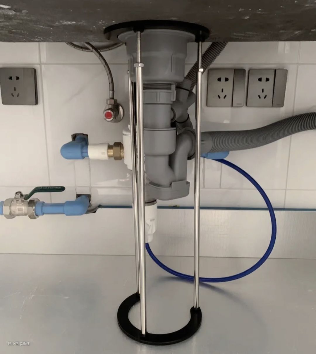 不过,也可以不用非得专门买水槽支撑杆,用伸缩杆就可以,还更灵活,不用担心伸缩杆掉落。