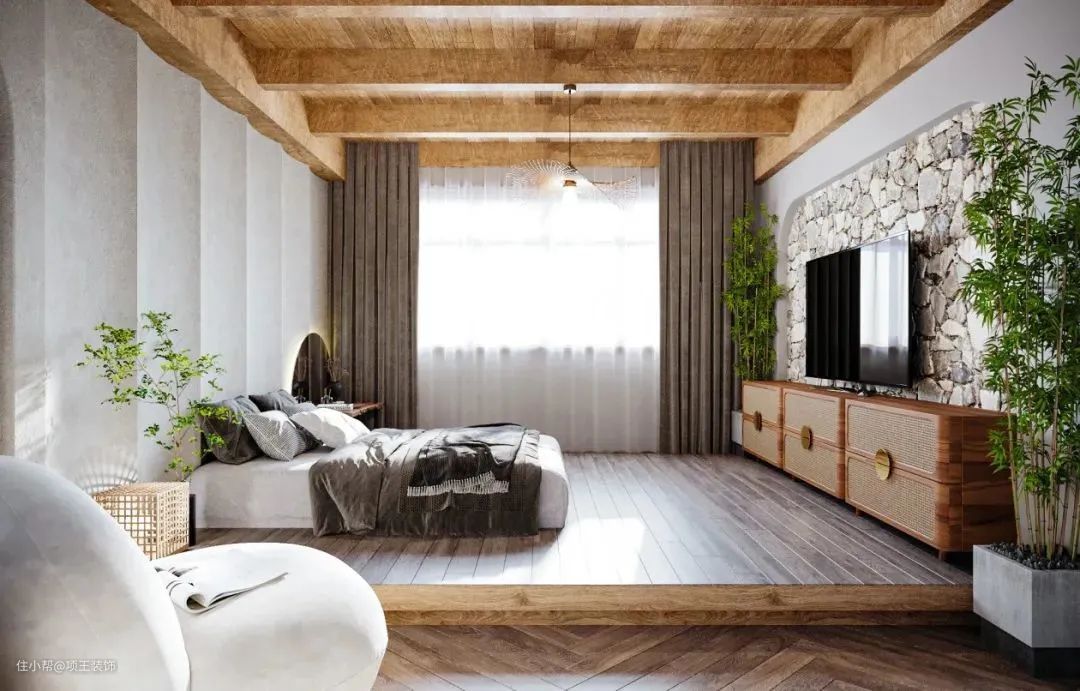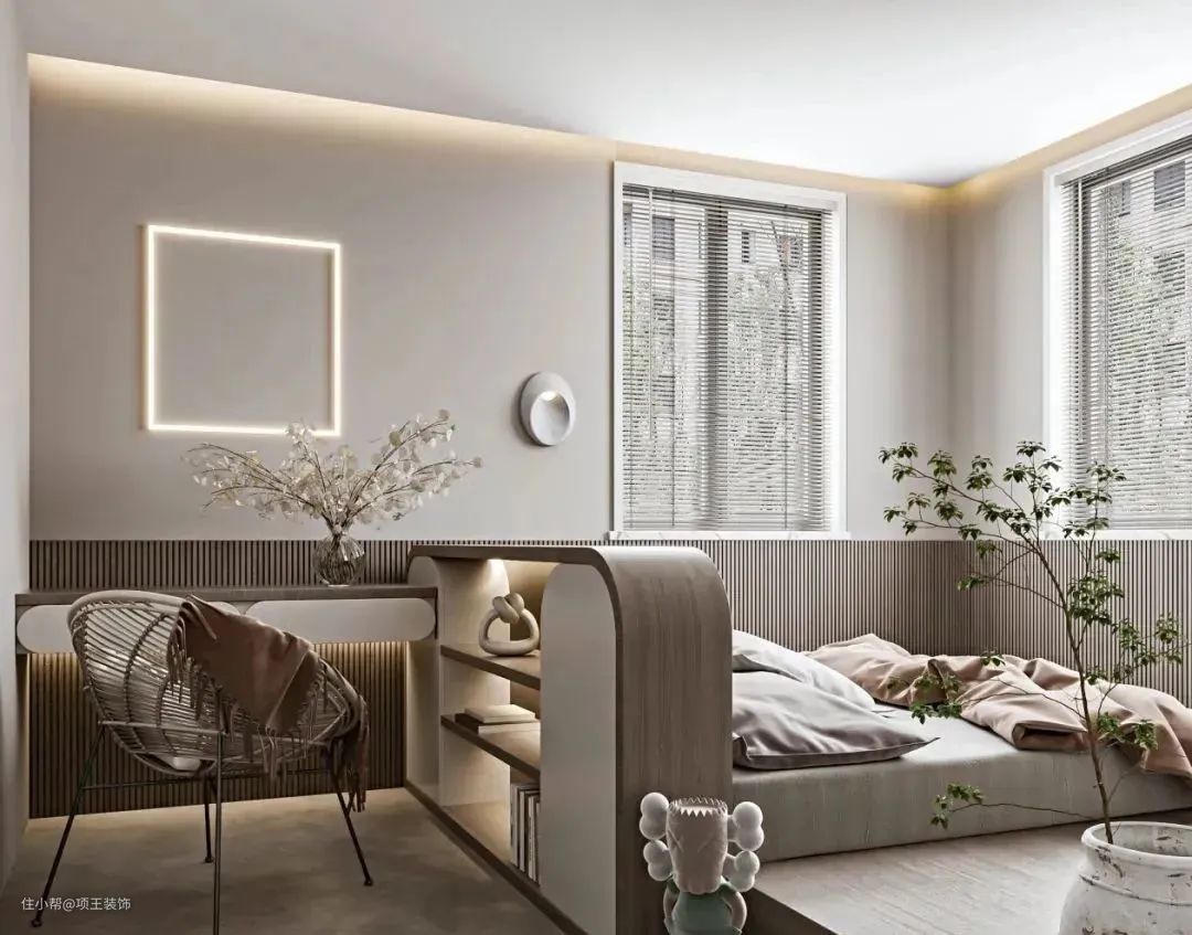 如果房间安装的是外飘窗的话,三面玻璃,我们的建议呢是在外部安装窗帘,将飘窗的部分隔离出去,不与室内共享空间,这种设计的话隔热、隔音的功能比较强,适合喜欢安静不喜欢吵闹的家庭。