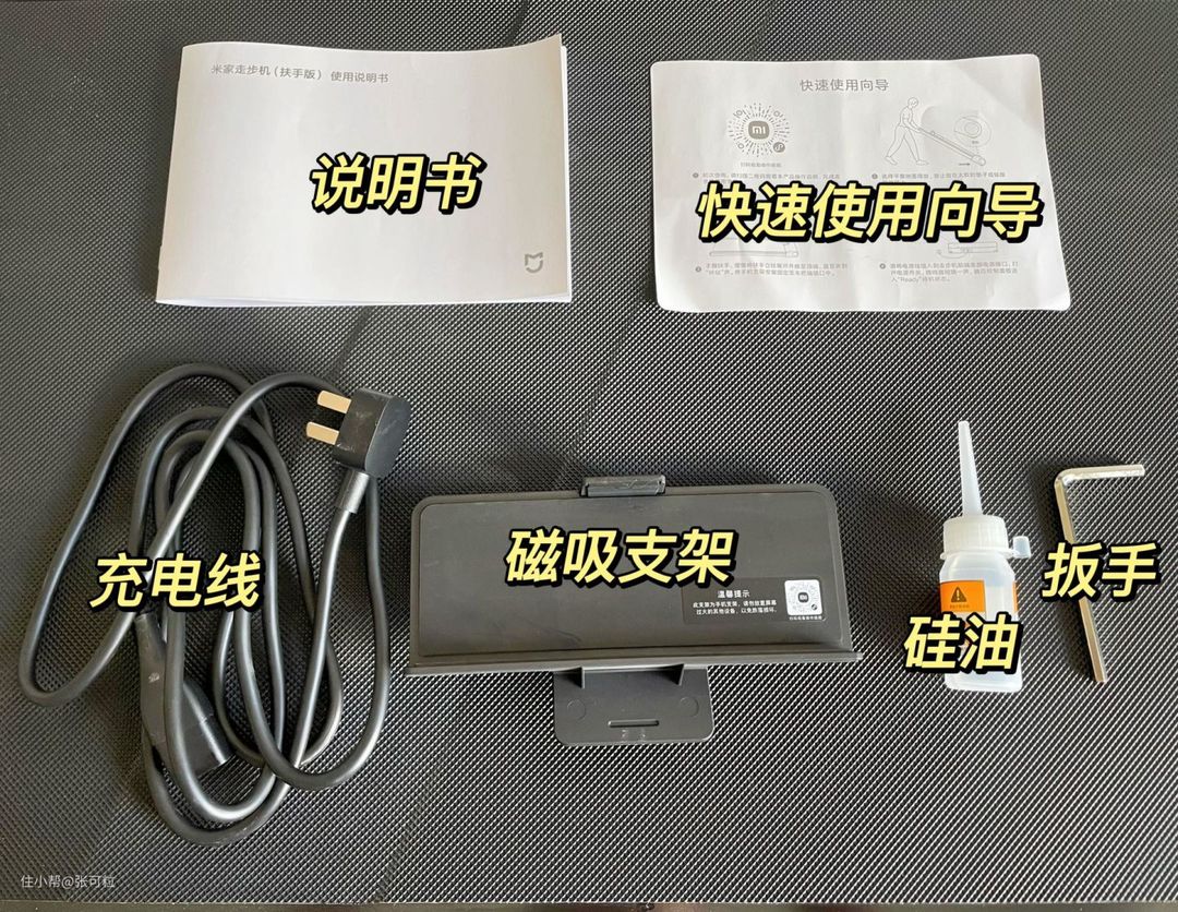 除了有走步机主机,还随机配备了电源充电线、手机支架、扳手和硅油,说明书和快速使用向导。