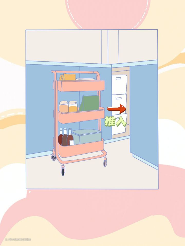 优点:没有收纳死角,相当于是榨干了所有收纳空间,但是需要提前量好外侧留空的尺寸,购买合适尺寸的带轮小推车,并且,由于少出了一部分柜体,所以价格也会相对降低一些。