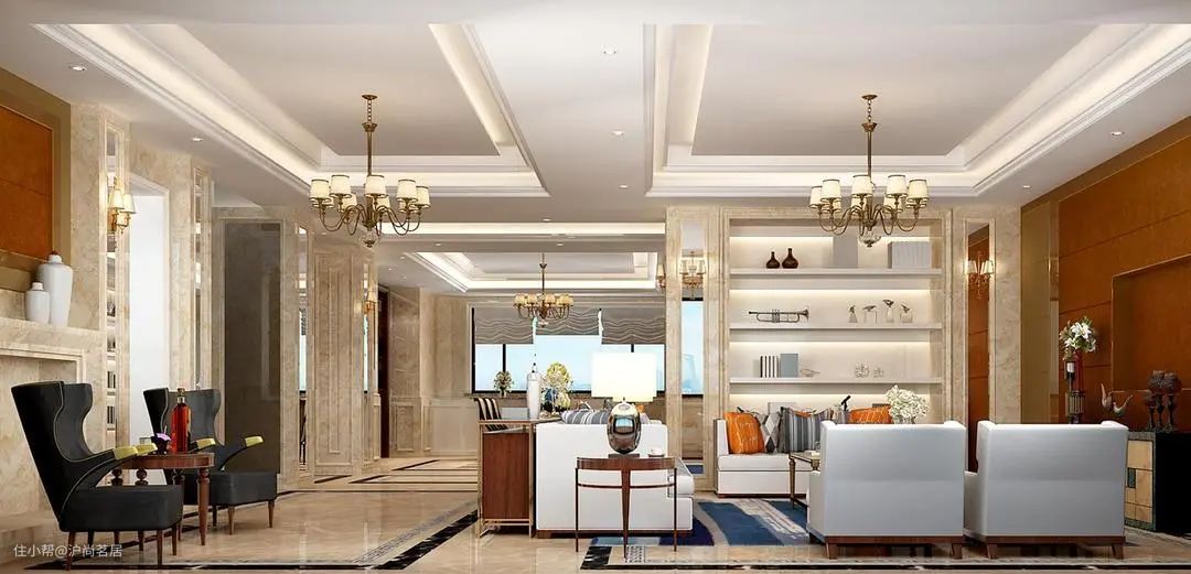 如果是有吊顶的客厅,因为吊顶是安装筒灯,灯带、射灯的好地方,因此在灯光布置方面也会有更多选择。