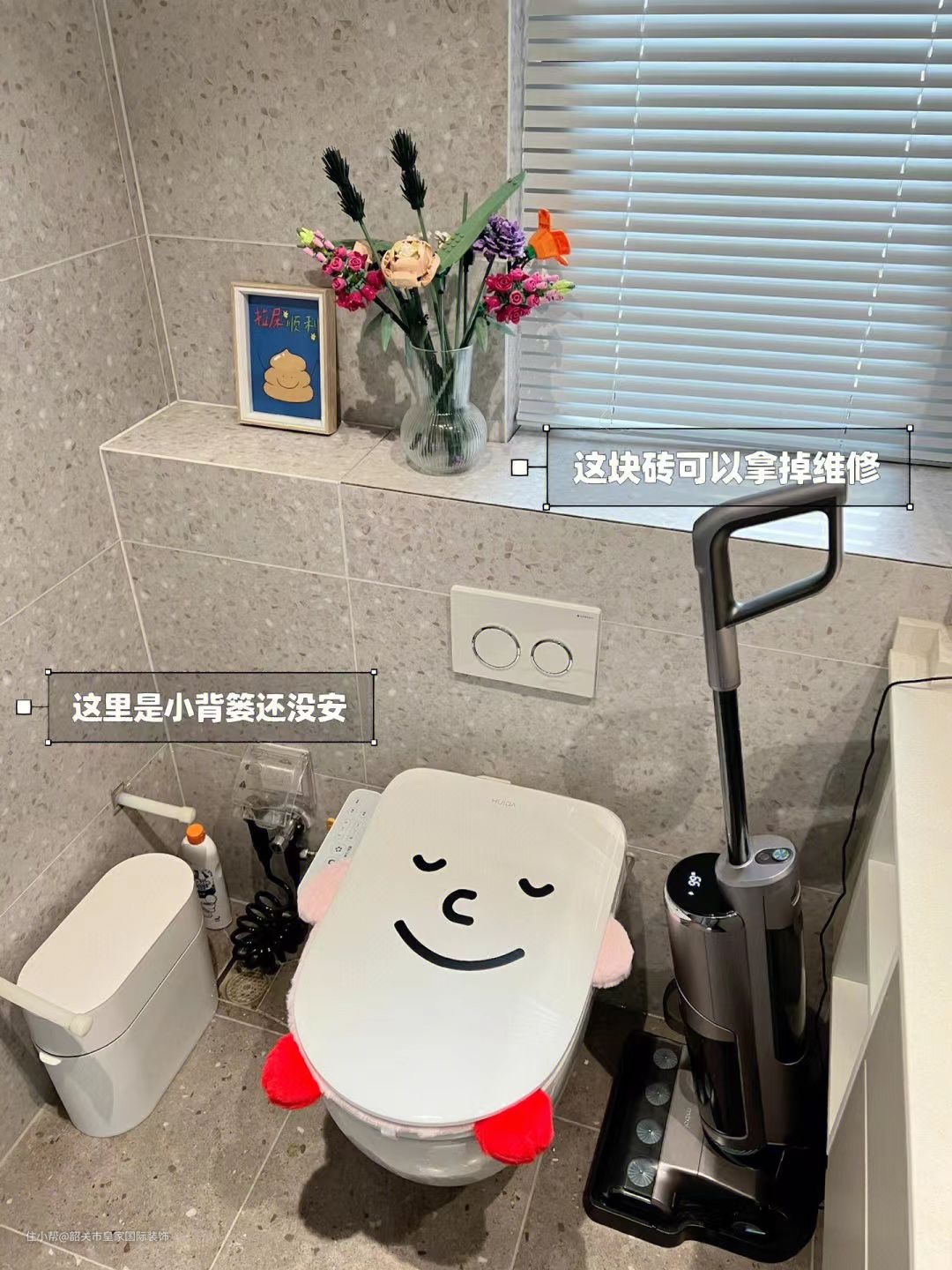 ▪️因为马桶做了移位所以装了壁挂马桶,目前用着没什么问题,承重也不用担心。马桶上方的瓷砖留了一块可活动位置,如果马桶需要维修打开这里就可以了。