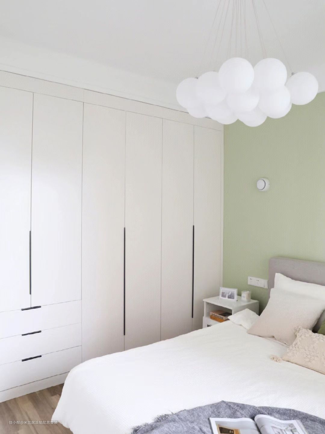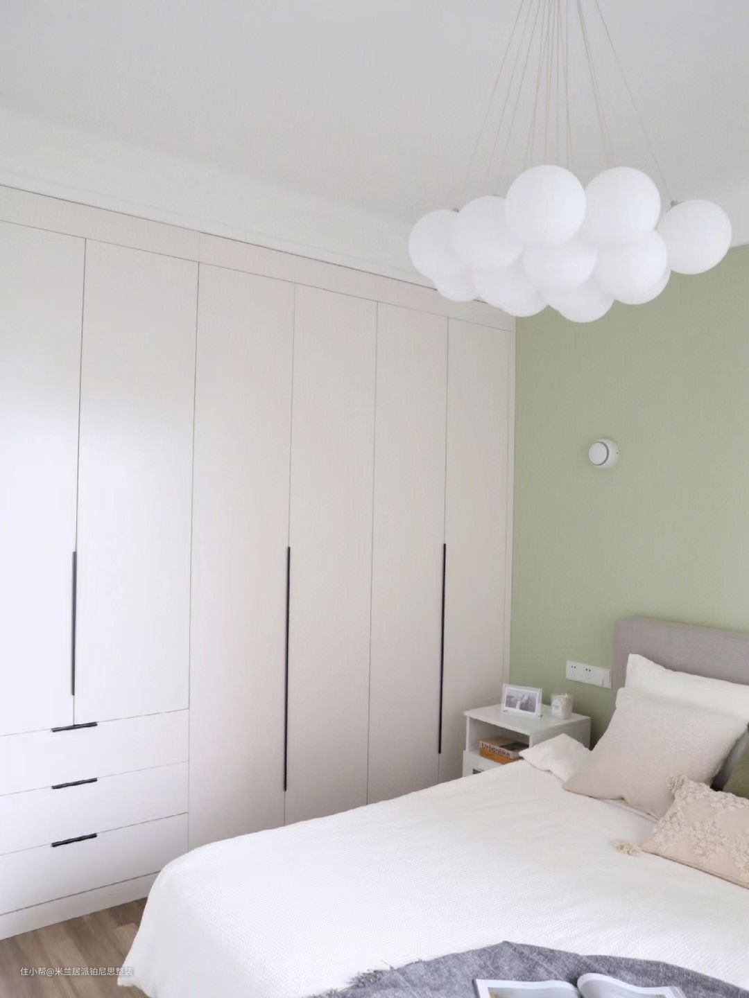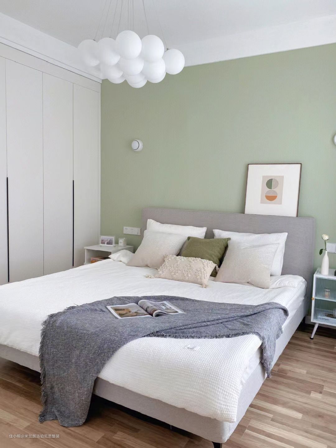 卧室设计丨看到绿色就无法控制的愉悦米兰居派铂尼思整装2022-11-21整体视觉非常整洁干净清爽的卧室地板选了比较自然原木色因为对绿色独有的偏心所以主卧床头墙刷了佐敦8302乳胶漆其余墙面全部留白颜色都是经过自己微调后的呈现效果~奶绿色与白色很养眼的一组配色。