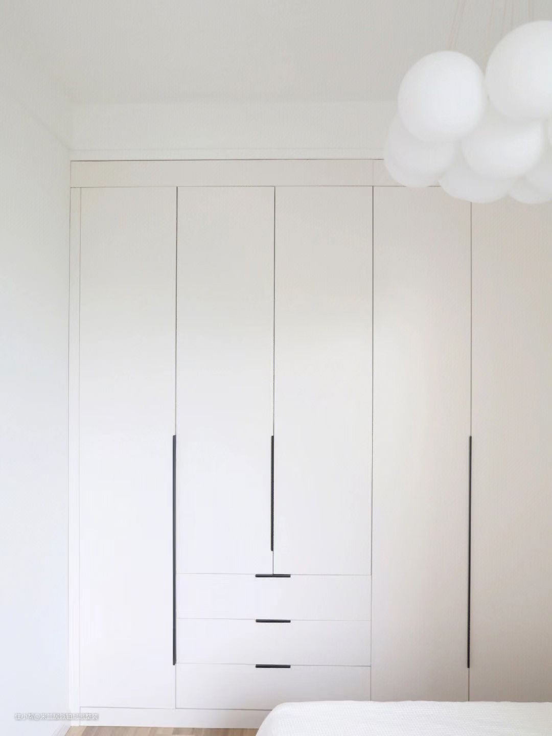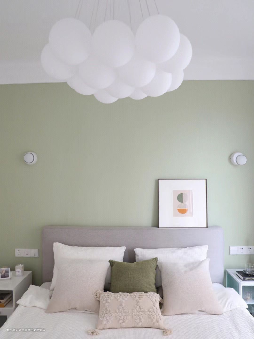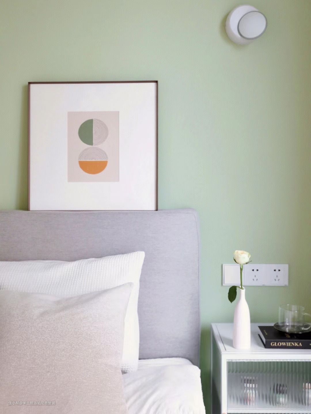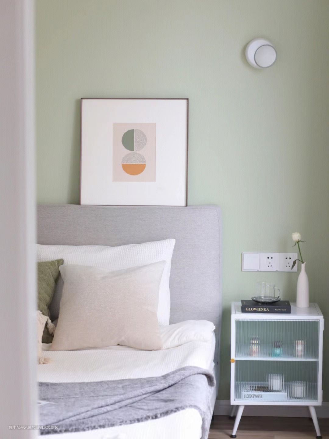 卧室设计丨看到绿色就无法控制的愉悦米兰居派铂尼思整装2022-11-21整体视觉非常整洁干净清爽的卧室地板选了比较自然原木色因为对绿色独有的偏心所以主卧床头墙刷了佐敦8302乳胶漆其余墙面全部留白颜色都是经过自己微调后的呈现效果~奶绿色与白色很养眼的一组配色。
