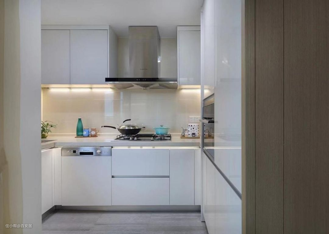 厨房墙砖和地砖皆是浅灰色大理石纹瓷砖,色泽低调纯净,调和了白色的柜体和浅灰色台面的搭配,而嵌在上壁空间的吊柜则与天花相协调,视觉上强化了功能划分。厨房空间干净整洁、自然舒适。
