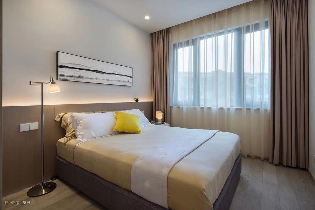 原木色地板搭配棕黄色布艺窗帘,和整个空间的氛围相协调,再加上香槟色和白色的绸缎质地床品,温暖中不失温馨感。做旧的金属落地台灯精致时尚,明黄色抱枕与起居室的明黄色元素对应,同时也为空间增添了一抹生命力。