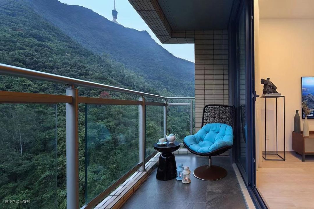 阳台可谓是个绝佳之地,正对重叠起伏的山峦,景色十分优美,空气清新,采光充足,视野开阔,以最大的承接面来引阳光入室内。