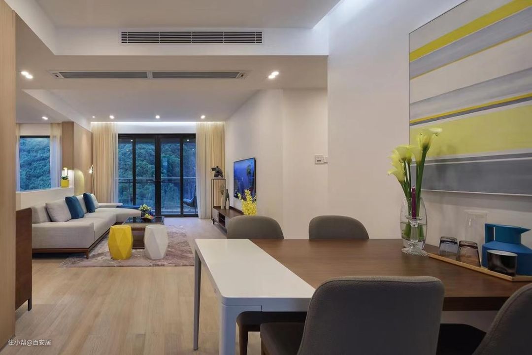 原木色和白色拼接的简约餐桌,配上浅灰色软皮靠椅,视觉上自然且舒适。另外,悬挂在餐厅背景墙上的灰、白、黄三色几何图案挂画,与整个空间配色和氛围相协,与无形中,为餐厅增添了活力和生命力。