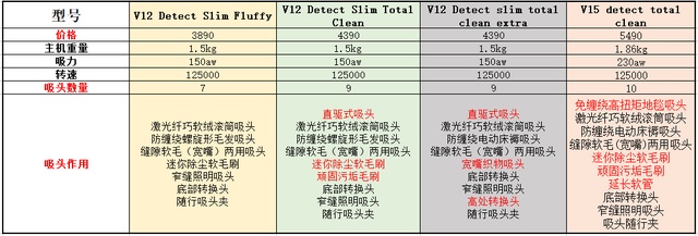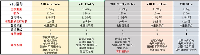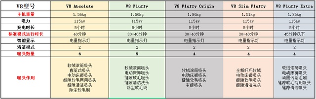 销量最好的是最新上市的V8 Fluffy Extra,不难看出,v8各型号之间的参数出入不是很大,价格相差也不是很大,主要区别还是在于机身重量以及刷头的配置,个人推荐V8 Fluffy Extra。