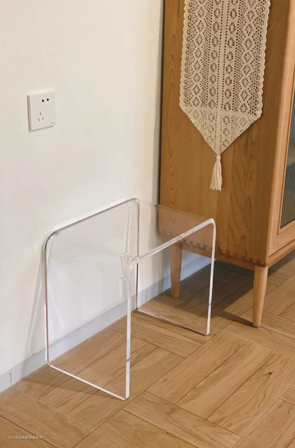 四块长条形木板两两一组呈90°拼贴,乍一看有点凌乱,但乱中有序,视觉上类似于中国结的编法。