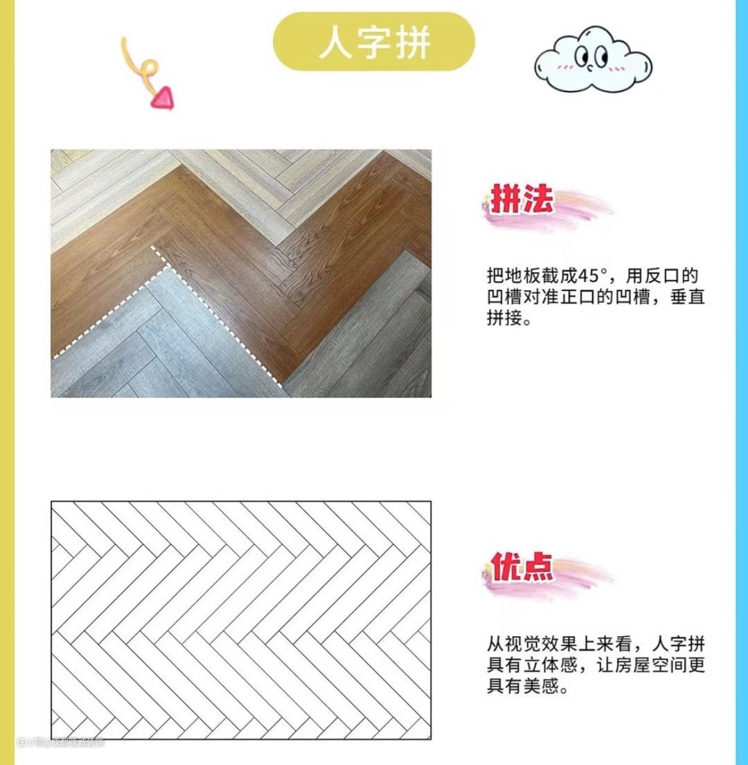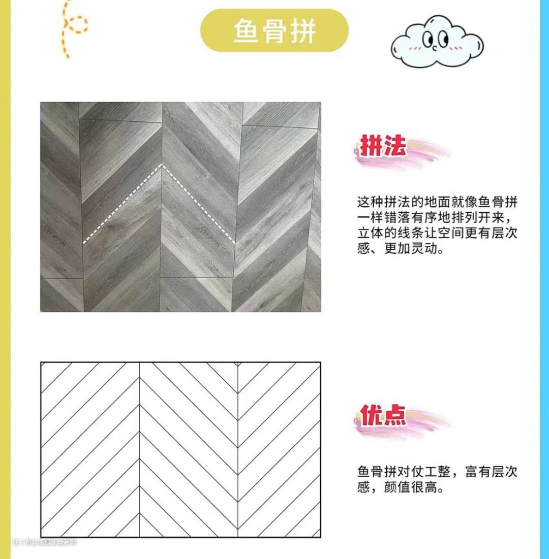 总的来说,工字拼法性价比最高,不仅简单易操作,也容易搭配各种风格;预算充足的用户可以选择个性化的鱼骨拼和人字拼;其他拼法更加独特亮眼,如果不差钱,值得—试。
