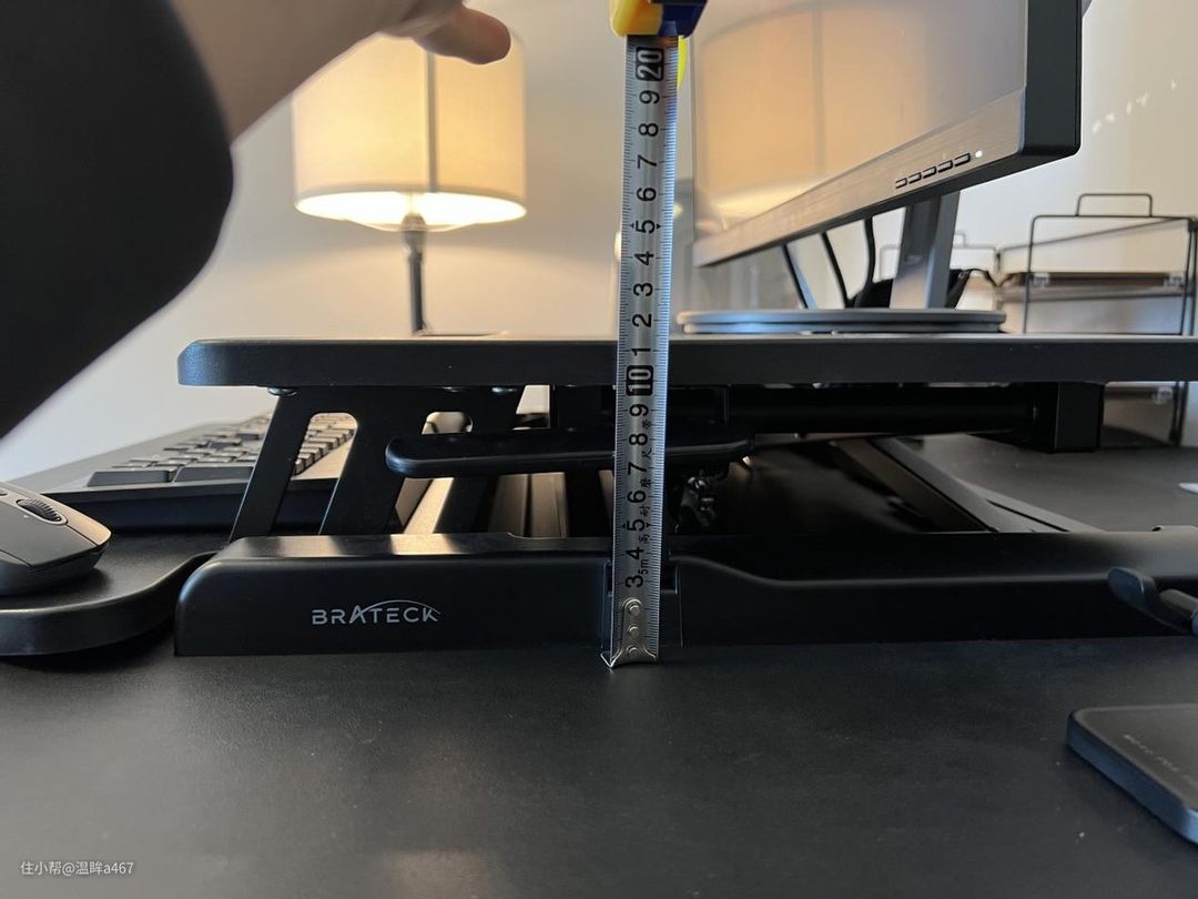 外观上D460的设计采用的是X形支架可升降的造型设计,通过X形支架的调节实现高低调节,实际我测量的结果是42.0cm,最低高度是11.0cm,实测我180cm的身高,在达到最大高度的时候,将升降台在正常高度的办公桌上时,完全可以实现站立办公。