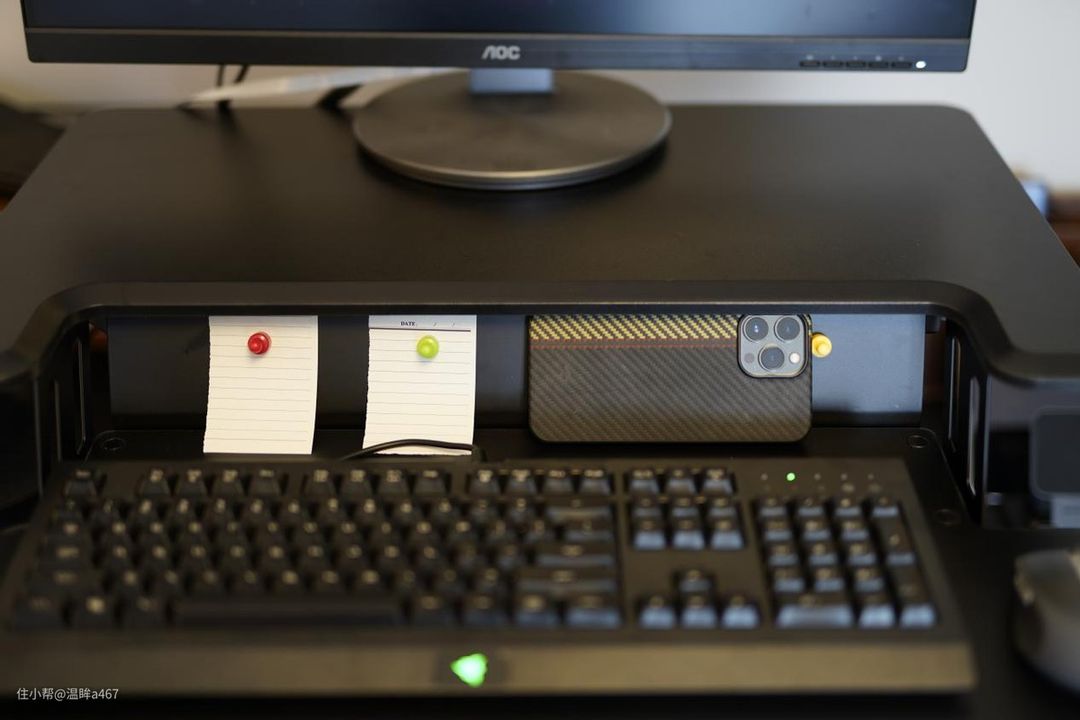 在细节的设计上,D460也体现了以人为本,方便办公的特点,专门设置了一个挡板,这个设计很贴心,相当于给台内设置了一个有一点私密空间的多功能区域,比如代办事项可分优先级用磁钉吸附在挡板上,提高工作效率,也可以侧放手机,适合在开视频会议的时候使用,不过放手机的时候需要注意,如果比较宽的手机建议平放,侧放可能空间有些不够。