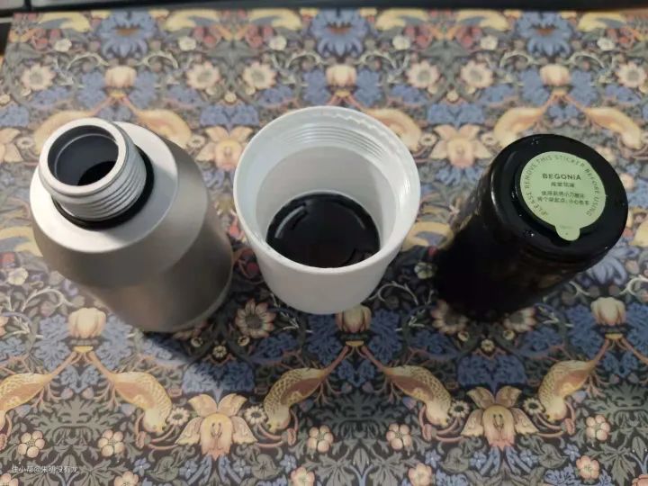 手柄拧下来拆开,里面有一个黑色的小罐子,拿出来之后发现是一个香精瓶——官方的说法叫做营养盒。这里装的就是特殊配方的香精,含有丰富的胶原蛋白、VC和香薰材料。可以在释放VC除氯的同时,释放营养成分。