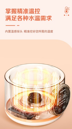 主打控温和煮甜品,面板控制很简单,只有基本的四个按键,简单易懂,家里老人操作起来也很方便;发热底盘采用常见的食品级不锈钢,温控探头被隐藏在发热底盘内部,使底盘密封性更好,还减少了胶水的使用,安全有保障。