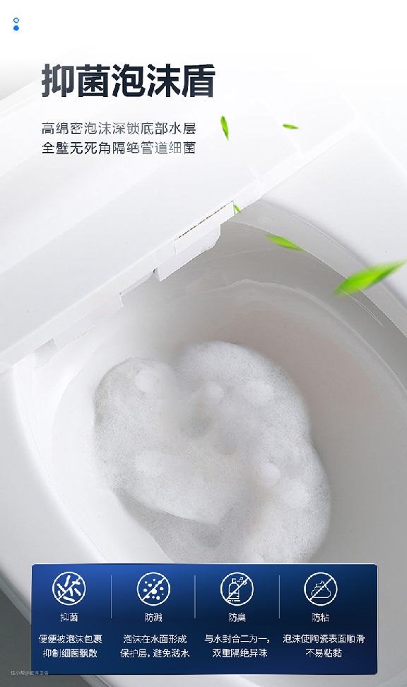 还有更多其他人性化的设计,比如防溅泡沫盾,有些智能马桶没有绵密的泡沫盾隔离水花,上大号老是被溅到,防臭就更不用多说!选择带有防溅泡沫盾功能的,当你如厕时,马桶内壁会自动形成一层高绵密泡沫,覆盖水面,避免溅水,同时阻止细菌随冲水气旋飘入空中。