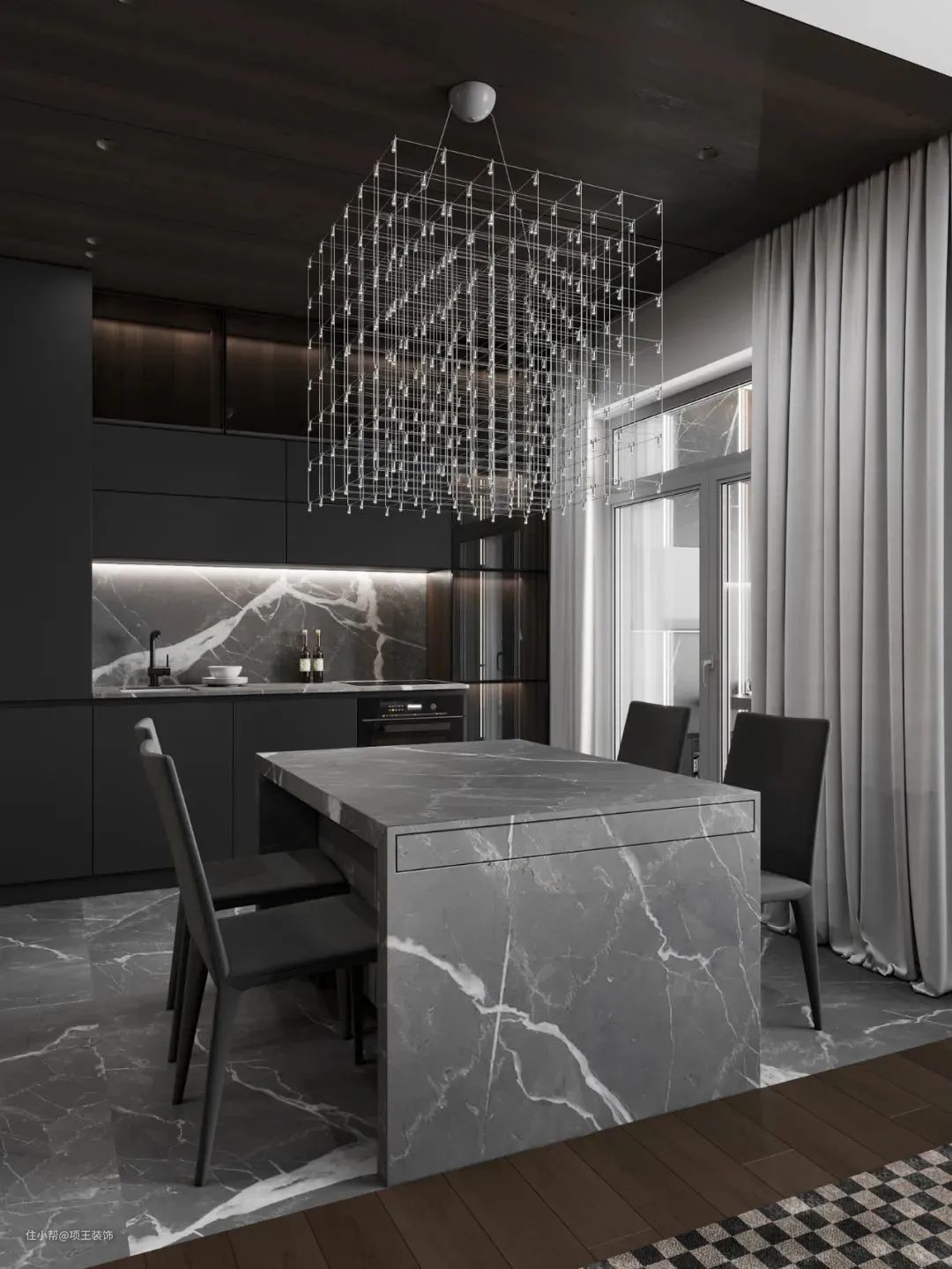 现在市面上的装修风格大多偏简约轻奢一类,像这类风格往往喜欢在餐厅或厨房位置做一个吧台来提升品位和增加功能性。一般吧台都的设计是比较简单的,所以,我们可以使用岩板。