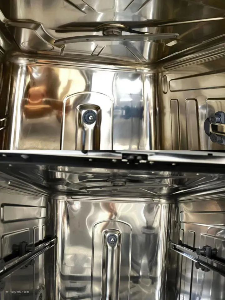 内部构造分为上碗篮和下碗篮,两层碗篮都足够大,附带筷笼。其材质前文说过了,整体内腔为不锈钢材质,这一点很多劣质洗碗机为了省材料内胆和底都是用的塑料材质。而不锈钢的优势不仅不易残留油渍,而且烘干更快,大家在购买洗碗机的时候可以注意这部分。