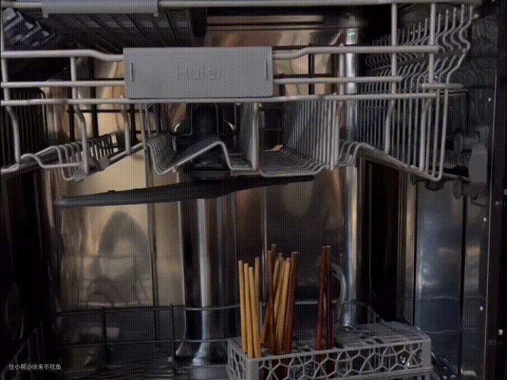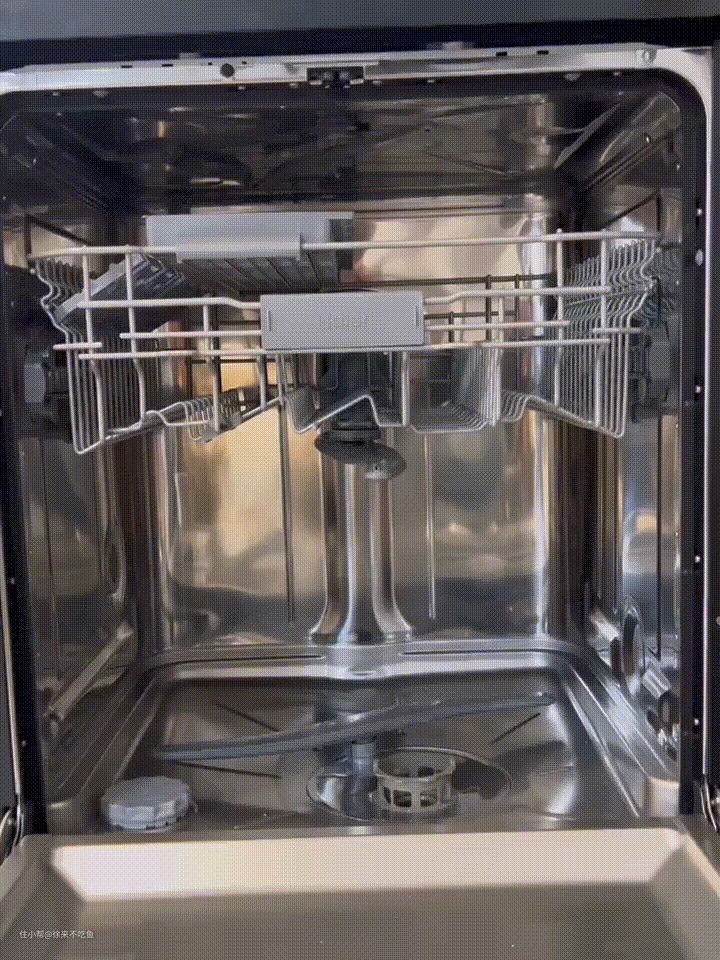 给大家看看整个喷淋臂的操作,餐具放在碗篮中,然后喷淋臂开始操作运转。为了方便大家观看,我把下碗篮取出来了。