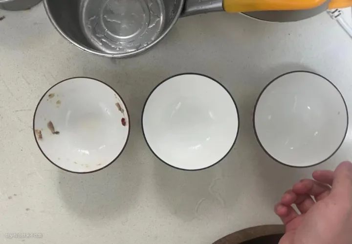 这是三个都是还未洗的,再给大家看看最左边的碗,清洗后的程度。