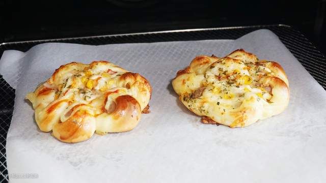 小披萨面包用的面团和牛角包是同样的,不过是将两个小面团切边然后卷上香肠,然后二次发酵,发酵完成后,中间撒洋葱丁、芝士碎、玉米粒,表面刷蛋液。