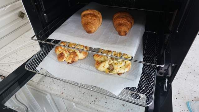 牛角面包和小披萨面包分为两层一起烤的,200℃,20分钟,不过烤15分钟后,小披萨面包表面撒芝士碎、沙拉酱和少许番茄酱。然后继续就可以了。